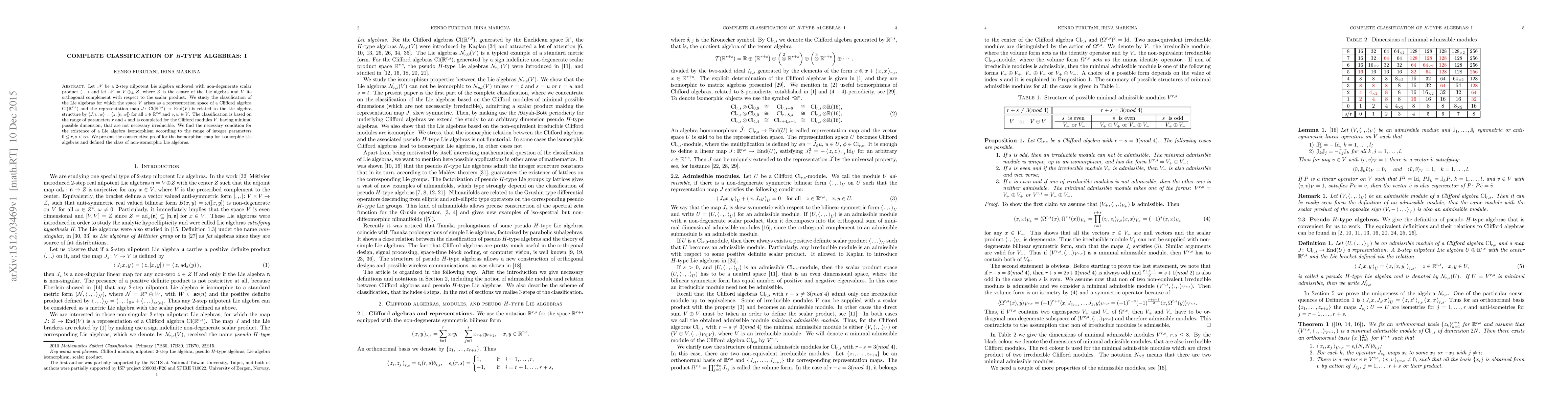 Let $\mathscr N$ be a 2-step nilpotent Lie algebra endowed with non-degenerate scalar product $\langle.\,,.\rangle$ and let $\mathscr N=V\oplus_{\perp}Z$, where $Z$ is the centre of the Lie algebra and $V$ its orthogonal complement with respect to the scalar product. We study the classification of the Lie algebras for which the space $V$ arises as a representation space of a Clifford algebra $\Cl(\mathbb R^{r,s})$ and the representation map $J\colon \Cl(\mathbb R^{r,s})\to(V)$ is related to the Lie algebra structure by $\langle J_zv,w\rangle=\langle z,[v,w]\rangle$ for all $z\in \mathbb R^{r,s}$ and $v,w\in V$. The classification is based on the range of parameters $r$ and $s$ and is completed for the Clifford modules $V$, having minimal possible dimension, that are not necessary irreducible. We find the necessary condition for the existence of a Lie algebra isomorphism according to the range of integer parameters $0\leq r,s<\infty$. We present the constructive proof for the isomorphism map for isomorphic Lie algebras and defined the class of non-isomorphic Lie algebras.