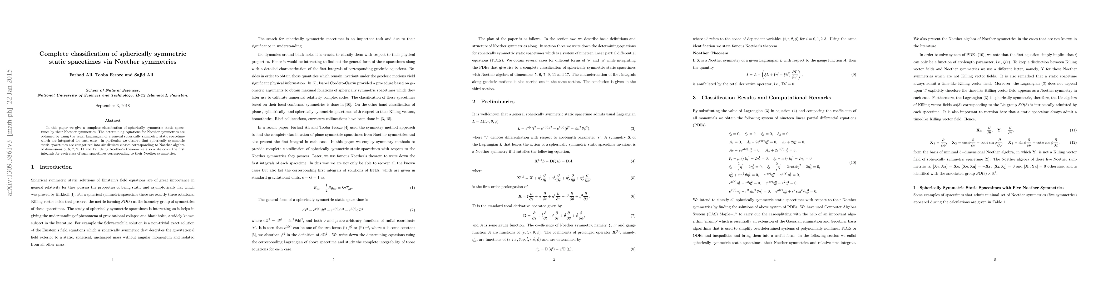 This paper classifies spherically symmetric static spacetimes based on their Noether symmetries, identifying six distinct classes corresponding to different Noether algebra dimensions. It also derives first integrals for each class and presents new spherically symmetric static solutions.