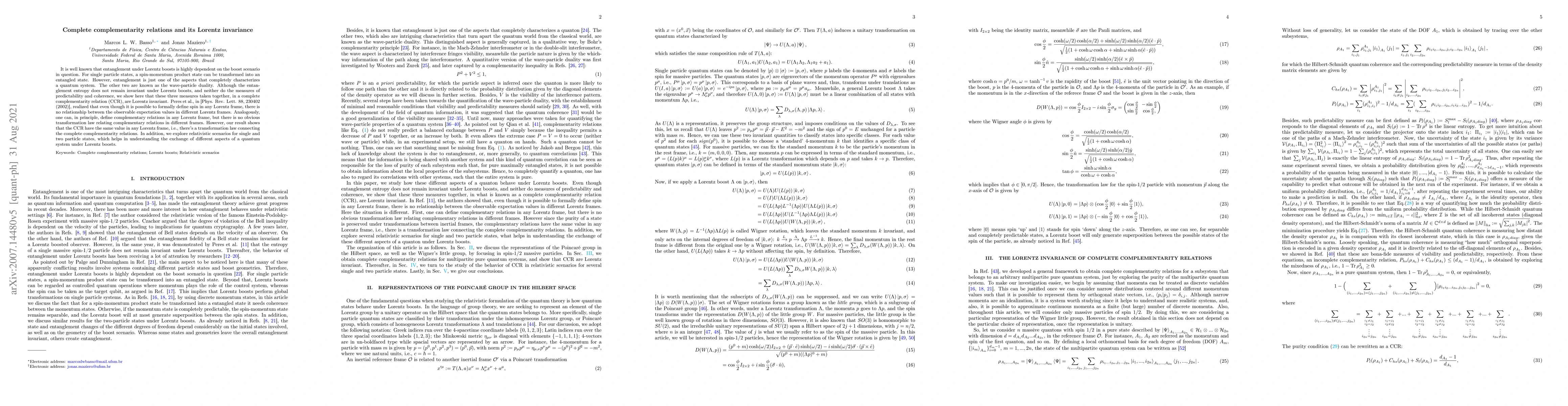 It is well known that entanglement under Lorentz boosts is highly dependent on the boost scenario in question. For single particle states, a spin-momentum product state can be transformed into an entangled state. However, entanglement is just one of the aspects that completely characterizes a quantum system. The other two are known as the wave-particle duality. Although the entanglement entropy does not remain invariant under Lorentz boosts, and neither do the measures of predictability and coherence, we show here that these three measures taken together, in a complete complementarity relation (CCR), are Lorentz invariant. Peres et al., in [Phys. Rev. Lett. 88, 230402 (2002)], realized that even though it is possible to formally define spin in any Lorentz frame, there is no relationship between the observable expectation values in different Lorentz frames. Analogously, even though it is possible to formally define complementarity in any Lorentz frame, in principle, there's no relationship between the complementarity relations of different Lorentz frames. However, our result shows that it's possible to connect complete complementarity relations in different Lorentz frames. In addition, we explore relativistic scenarios for single and two particle states, which helps in understanding the exchange of different aspects of a quantum system under Lorentz boosts.
