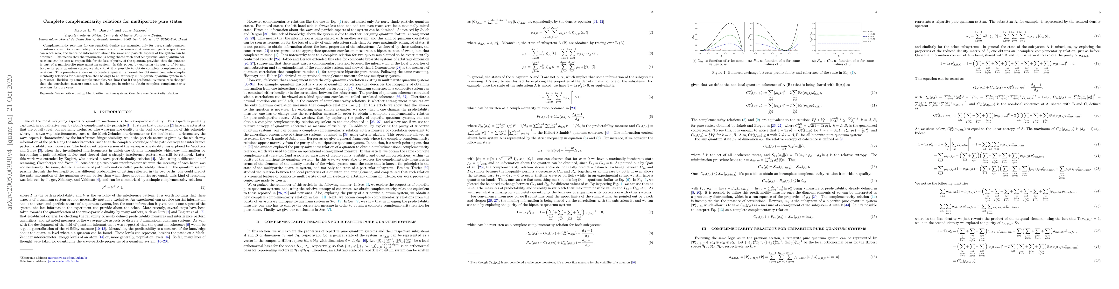 Complementarity relations for wave-particle duality are saturated only for pure, single-quanton, quantum states. For a completely incoherent state, it is known that wave and particle quantifiers can reach zero, and hence no information about the wave and particle aspects of the system can be obtained. This means that the information is being shared with another systems, and quantum correlations can be seen as responsible for the loss of purity of the quanton, provided that the quanton is part of a multipartite pure quantum system. In this paper, by exploring the purity of bi- and tri-partite pure quantum states, we show that it is possible to obtain complete complementarity relations. This procedure allows us to create a general framework for obtaining complete complementarity relations for a subsystem that belongs to an arbitrary multi-partite quantum system in a pure state. Besides, by some simple examples, we show that if the predictability measure is changed then the correlation measure must also be changed in order to obtain complete complementarity relations for pure cases.