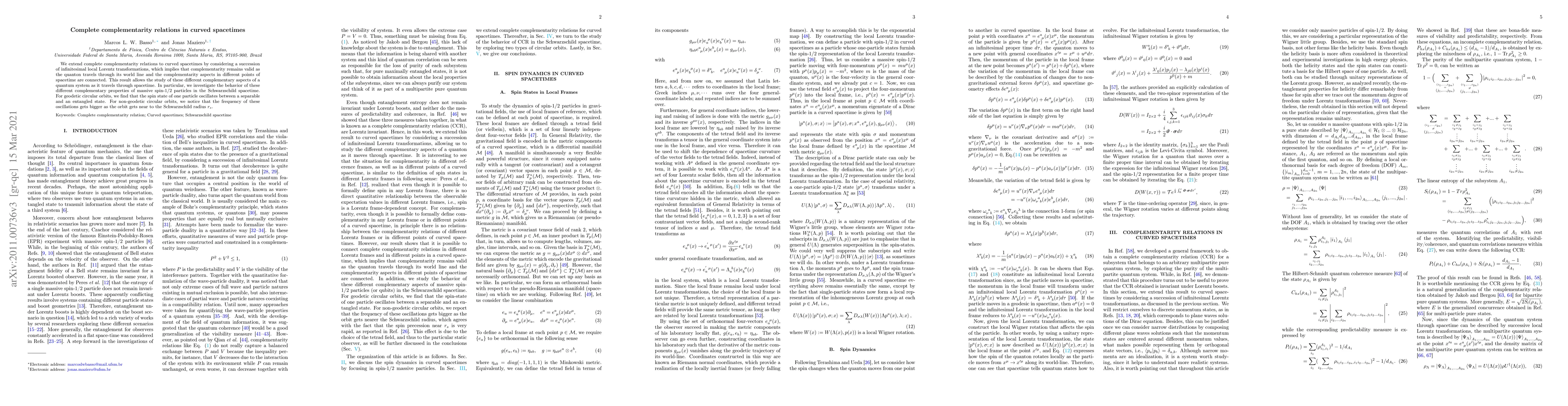 We extend complete complementarity relations to curved spacetimes by considering a succession of infinitesimal local Lorentz transformations, which implies that complementarity remains valid as the quanton travels through its world line and the complementarity aspects in different points of spacetime are connected. This result allows the study of these different complementary aspects of a quantum system as it travels through spacetime. In particular, we study the behavior of these different complementary properties of massive spin-$1/2$ particles in the Schwarzschild spacetime. For geodetic circular orbits, we find that the spin state of one particle oscillates between a separable and an entangled state. For non-geodetic circular orbits, we notice that the frequency of these oscillations gets bigger as the orbit gets nearer to the Schwarzschild radius $r_s$.
