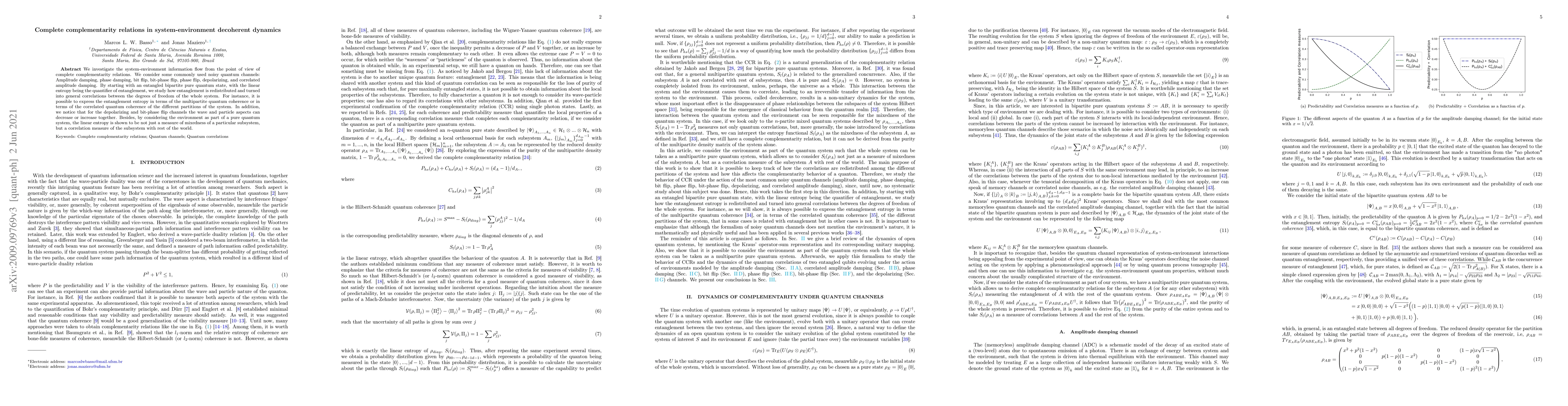 We investigate the system-environment information flow from the point of view ofcomplete complementarity relations. We consider some commonly used noisy quantum channels:Amplitude damping, phase damping, bit flip, bit-phase flip, phase flip, depolarizing, and correlatedamplitude damping. By starting with an entangled bipartite pure quantum state, with the linearentropy being the quantifier of entanglement, we study how entanglement is redistributed and turnedinto general correlations between the degrees of freedom of the whole system. For instance, it ispossible to express the entanglement entropy in terms of the multipartite quantum coherence or interms of the correlated quantum coherence of the different partitions of the system. In addition,we notice that for the depolarizing and bit-phase flip channels the wave and particle aspects candecrease or increase together. Besides, by considering the environment as part of a pure quantumsystem, the linear entropy is shown to be not just a measure of mixedness of a particular subsystem,but a correlation measure of the subsystem with rest of the world.
