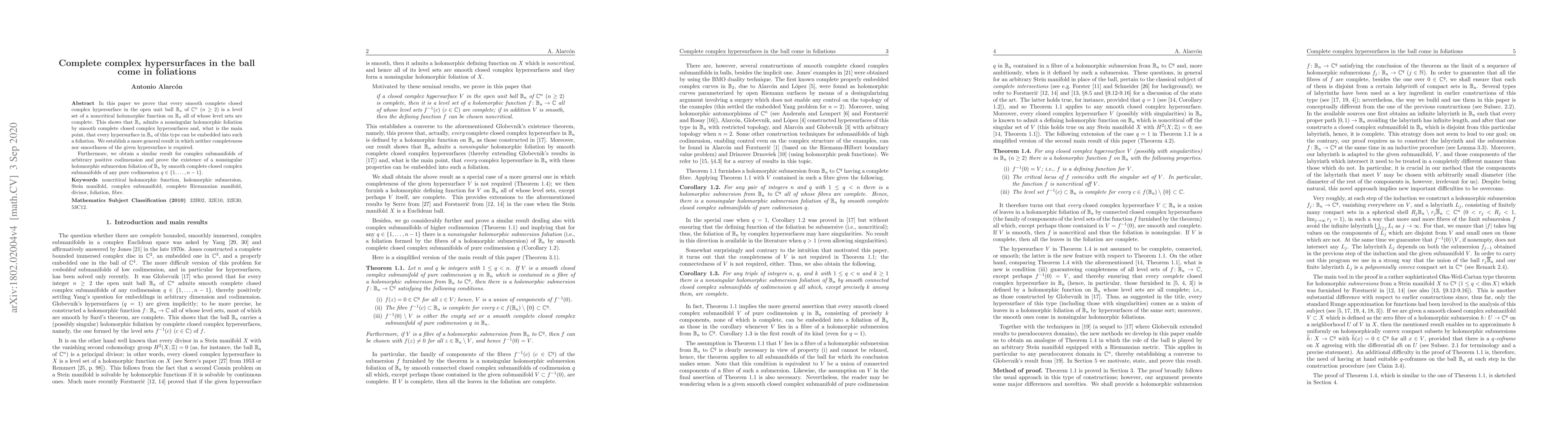 In this paper we prove that every smooth complete closed complex hypersurface in the open unit ball $\mathbb{B}_n$ of $\mathbb{C}^n$ $(n\ge 2)$ is a level set of a noncritical holomorphic function on $\mathbb{B}_n$ all of whose level sets are complete. This shows that $\mathbb{B}_n$ admits a nonsingular holomorphic foliation by smooth complete closed complex hypersurfaces and, what is the main point, that every hypersurface in $\mathbb{B}_n$ of this type can be embedded into such a foliation. We establish a more general result in which neither completeness nor smoothness of the given hypersurface is required. Furthermore, we obtain a similar result for complex submanifolds of arbitrary positive codimension and prove the existence of a nonsingular holomorphic submersion foliation of $\mathbb{B}_n$ by smooth complete closed complex submanifolds of any pure codimension $q\in\{1,\ldots,n-1\}$.