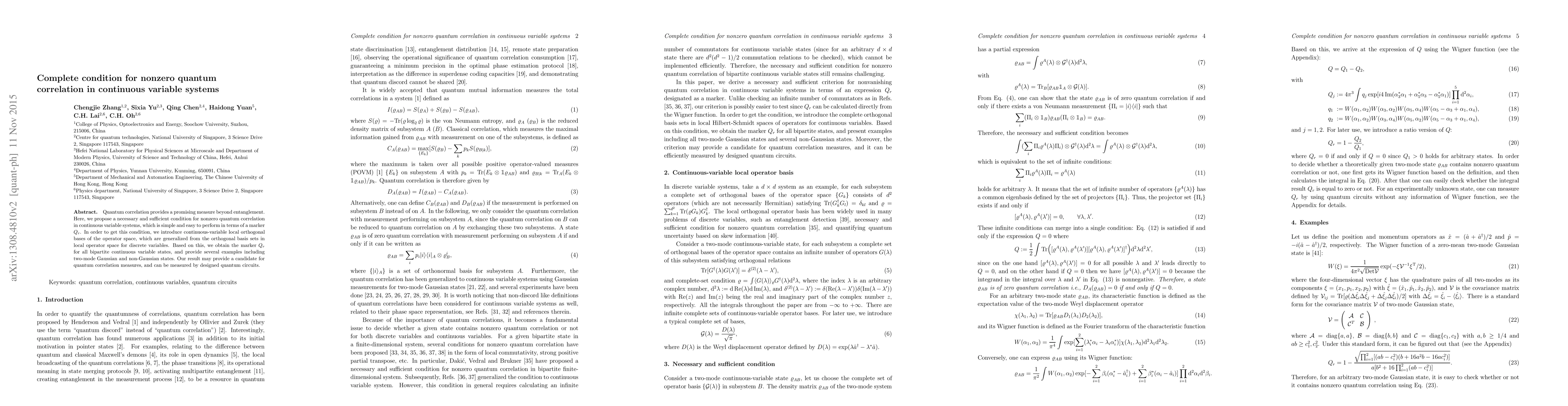 This paper proposes a necessary and sufficient condition for nonzero quantum correlation in continuous variable systems using a marker $Q_r$. The condition is based on generalized local orthogonal bases and can be measured using quantum circuits, offering a potential candidate for quantum correlation measures.