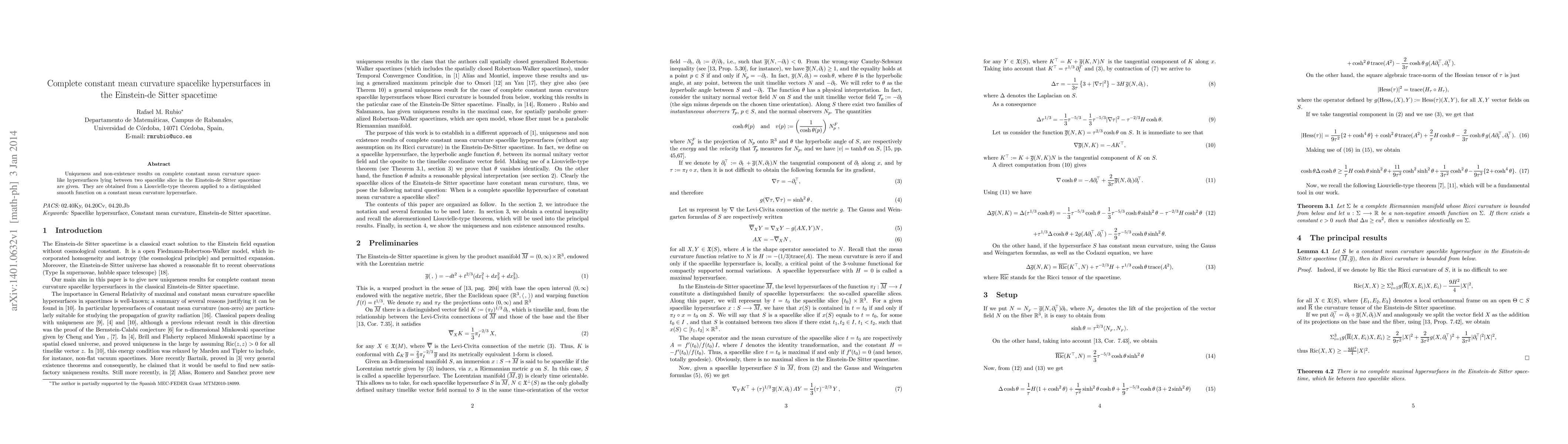 Summary: This paper establishes uniqueness and non-existence results for complete constant mean curvature spacelike hypersurfaces in the Einstein-de Sitter spacetime, utilizing a Liouvielle-type theorem on a distinguished smooth function on such hypersurfaces.