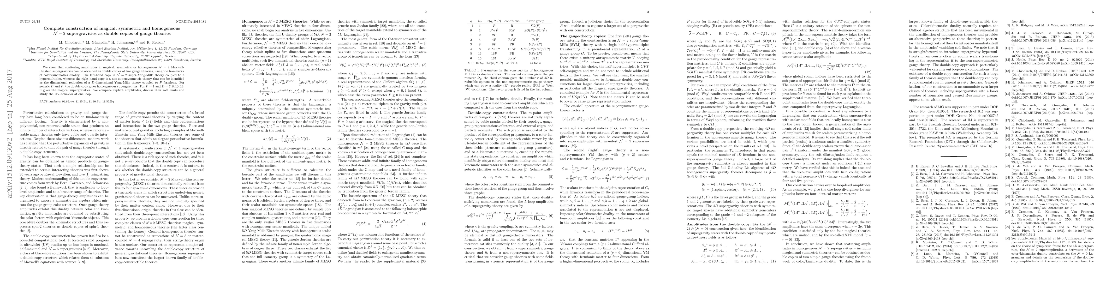 We show that scattering amplitudes in magical, symmetric or homogeneous N=2 Maxwell-Einstein supergravities can be obtained as double copies of two gauge theories, using the framework of color/kinematics duality. The left-hand-copy is N=2 super-Yang-Mills theory coupled to a hypermultiplet, whereas the right-hand-copy is a non-supersymmetric theory that can be identified as the dimensional reduction of a D-dimensional Yang-Mills theory coupled to P fermions. For generic D and P, the double copy gives homogeneous supergravities. For P=1 and D=7,8,10,14, it gives the magical supergravities. We compute explicit amplitudes, discuss their soft limit and study the UV-behavior at one loop.