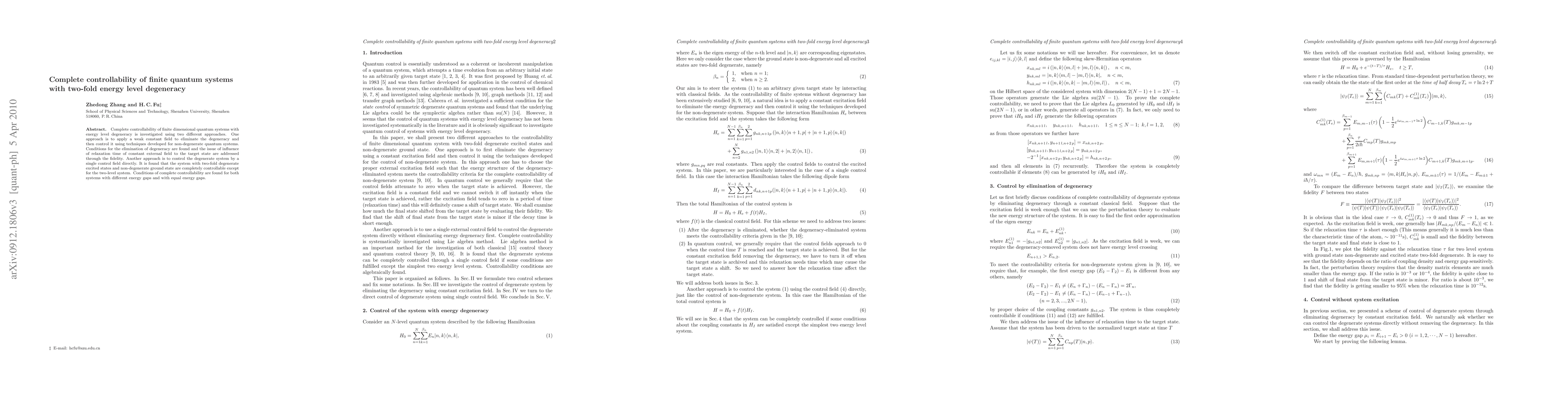 This paper investigates the complete controllability of finite quantum systems with two-fold energy level degeneracy using two methods: one involves applying a weak constant field to eliminate degeneracy, and the other directly controls the degenerate system with a single field. It finds conditions for controllability, especially highlighting the non-controllability of two-level systems.