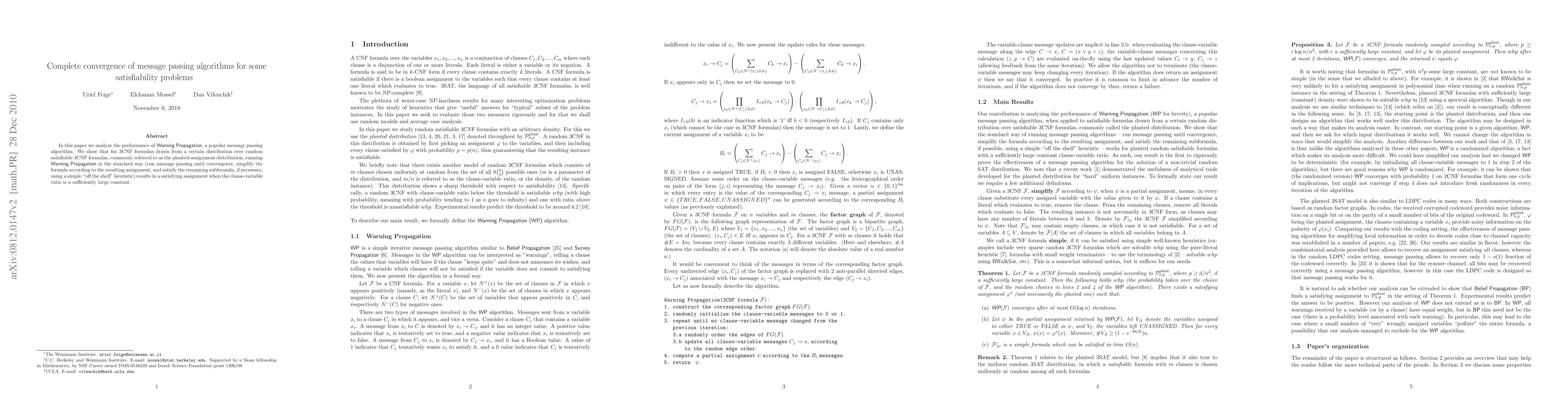 This paper demonstrates that Warning Propagation, a message passing algorithm, achieves complete convergence for satisfiable 3CNF formulas under a specific distribution, leading to a satisfying assignment when the clause-variable ratio exceeds a certain threshold. The analysis confirms the algorithm's effectiveness under these conditions.