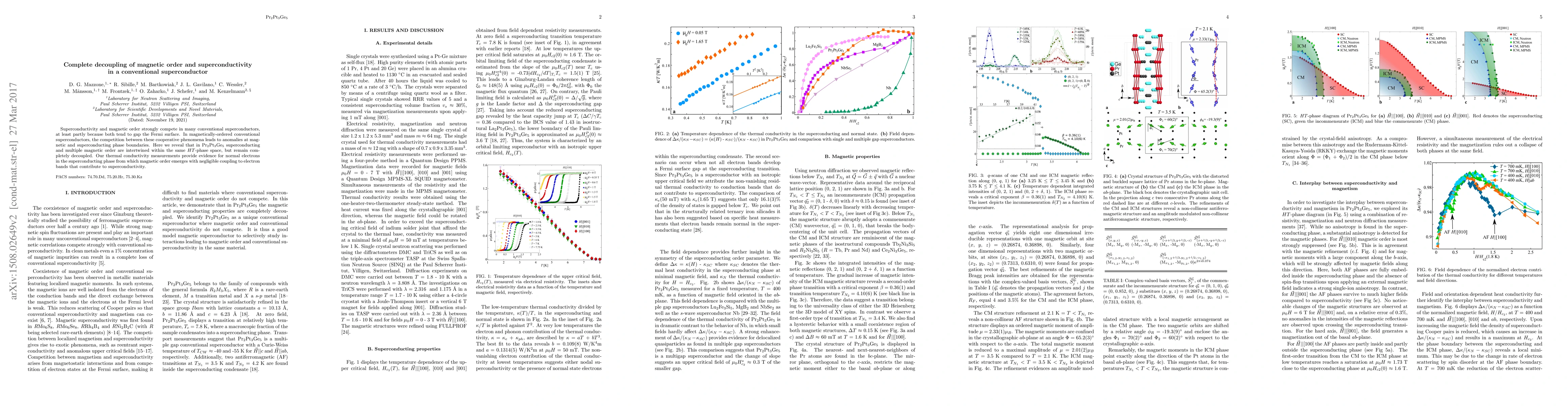 Superconductivity and magnetic order strongly compete in many conventional superconductors, at least partly because both tend to gap the Fermi surface. In magnetically-ordered conventional superconductors, the competition between these cooperative phenomena leads to anomalies at magnetic and superconducting phase boundaries. Here we reveal that in Pr2Pt3Ge5 superconducting and multiple magnetic order are intertwined within the same HT-phase space, but remain completely decoupled. Our thermal conductivity measurements provide evidence for normal electrons in the superconducting phase from which magnetic order emerges with negligible coupling to electron bands that contribute to superconductivity.