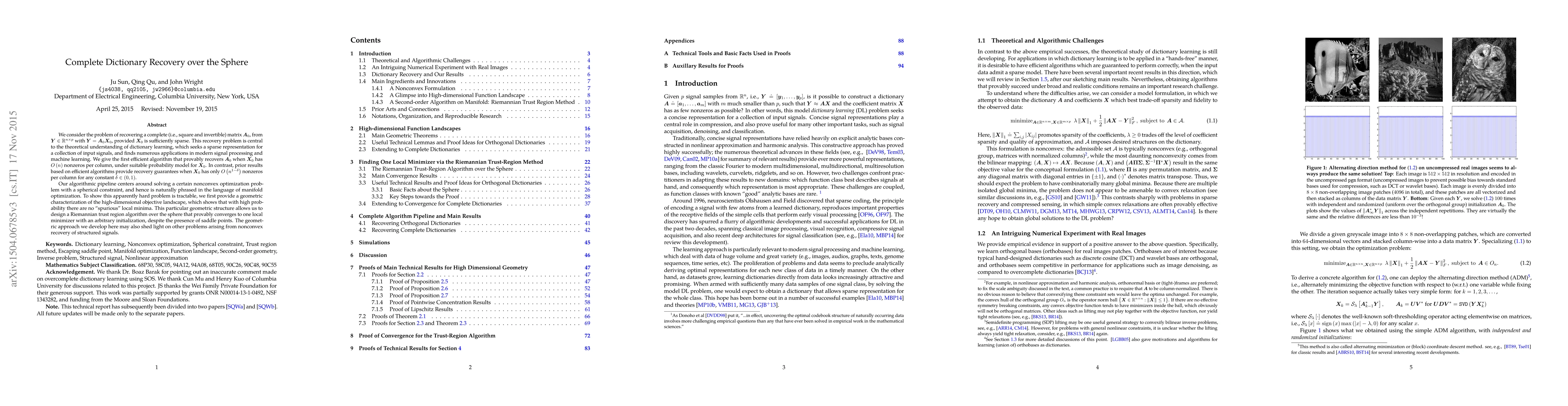 We consider the problem of recovering a complete (i.e., square and invertible) matrix $\mathbf A_0$, from $\mathbf Y \in \mathbb R^{n \times p}$ with $\mathbf Y = \mathbf A_0 \mathbf X_0$, provided $\mathbf X_0$ is sufficiently sparse. This recovery problem is central to the theoretical understanding of dictionary learning, which seeks a sparse representation for a collection of input signals, and finds numerous applications in modern signal processing and machine learning. We give the first efficient algorithm that provably recovers $\mathbf A_0$ when $\mathbf X_0$ has $O(n)$ nonzeros per column, under suitable probability model for $\mathbf X_0$. In contrast, prior results based on efficient algorithms provide recovery guarantees when $\mathbf X_0$ has only $O(n^{1-\delta})$ nonzeros per column for any constant $\delta \in (0, 1)$. Our algorithmic pipeline centers around solving a certain nonconvex optimization problem with a spherical constraint, and hence is naturally phrased in the language of manifold optimization. To show this apparently hard problem is tractable, we first provide a geometric characterization of the high-dimensional objective landscape, which shows that with high probability there are no "spurious" local minima. This particular geometric structure allows us to design a Riemannian trust region algorithm over the sphere that provably converges to one local minimizer with an arbitrary initialization, despite the presence of saddle points. The geometric approach we develop here may also shed light on other problems arising from nonconvex recovery of structured signals.
