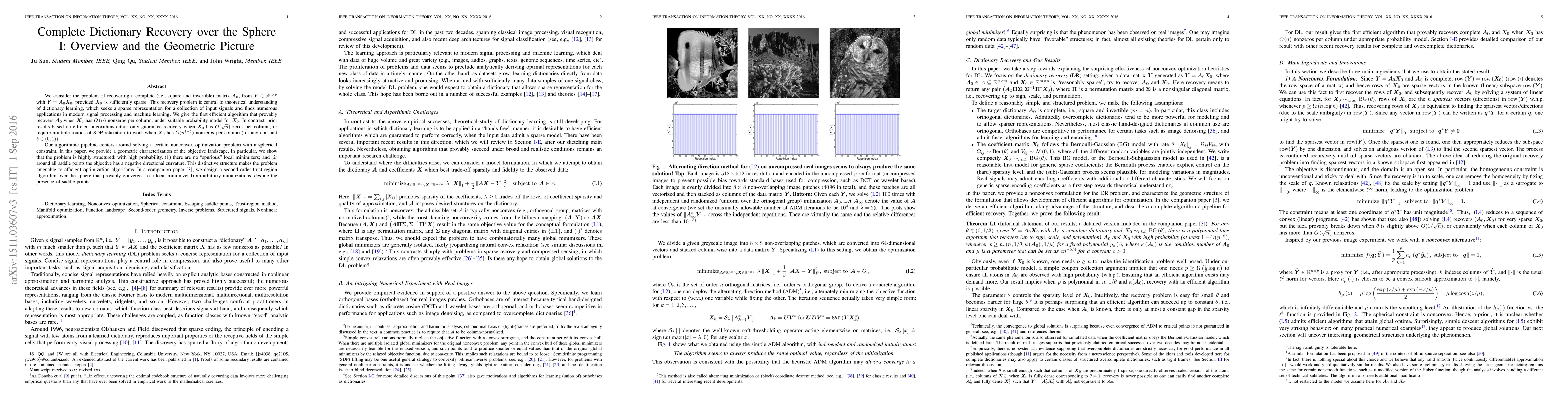 We consider the problem of recovering a complete (i.e., square and invertible) matrix $\mathbf A_0$, from $\mathbf Y \in \mathbb{R}^{n \times p}$ with $\mathbf Y = \mathbf A_0 \mathbf X_0$, provided $\mathbf X_0$ is sufficiently sparse. This recovery problem is central to theoretical understanding of dictionary learning, which seeks a sparse representation for a collection of input signals and finds numerous applications in modern signal processing and machine learning. We give the first efficient algorithm that provably recovers $\mathbf A_0$ when $\mathbf X_0$ has $O(n)$ nonzeros per column, under suitable probability model for $\mathbf X_0$. In contrast, prior results based on efficient algorithms either only guarantee recovery when $\mathbf X_0$ has $O(\sqrt{n})$ zeros per column, or require multiple rounds of SDP relaxation to work when $\mathbf X_0$ has $O(n^{1-\delta})$ nonzeros per column (for any constant $\delta \in (0, 1)$). } Our algorithmic pipeline centers around solving a certain nonconvex optimization problem with a spherical constraint. In this paper, we provide a geometric characterization of the objective landscape. In particular, we show that the problem is highly structured: with high probability, (1) there are no "spurious" local minimizers; and (2) around all saddle points the objective has a negative directional curvature. This distinctive structure makes the problem amenable to efficient optimization algorithms. In a companion paper (arXiv:1511.04777), we design a second-order trust-region algorithm over the sphere that provably converges to a local minimizer from arbitrary initializations, despite the presence of saddle points.