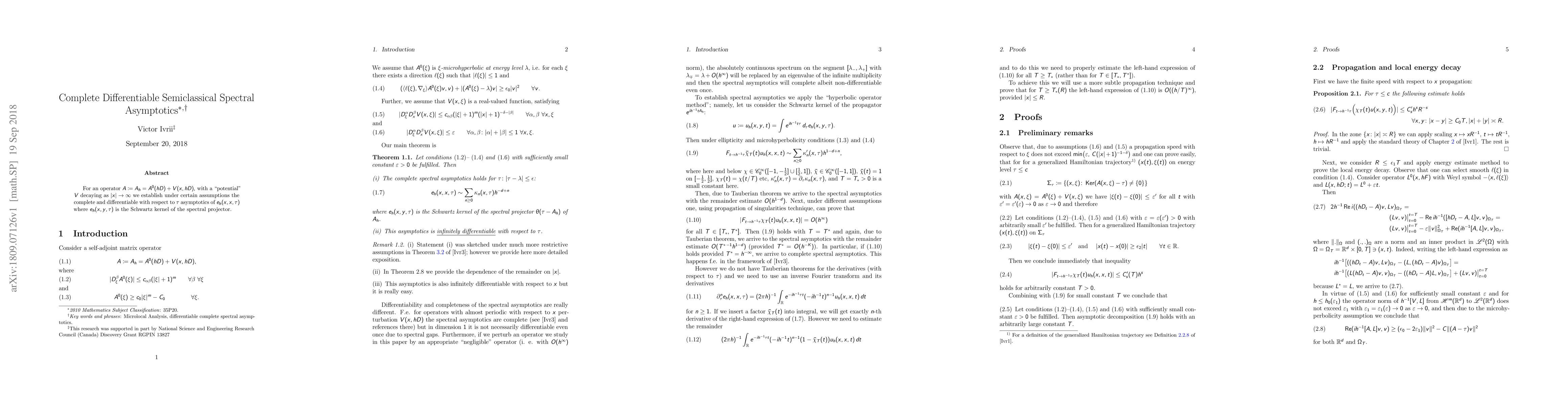 For an operator $A:= A_h= A^0(hD) + V(x,hD)$ with a "potential" $V$ decaying as $|x|\to \infty$ we establish under certain assumptions the complete and differentiable with respect to $\tau$ asymptotics of $e_h(x,x,\tau)$ where $e_h(x,y,\tau)$ is the Schwartz kernel of the spectral projector.