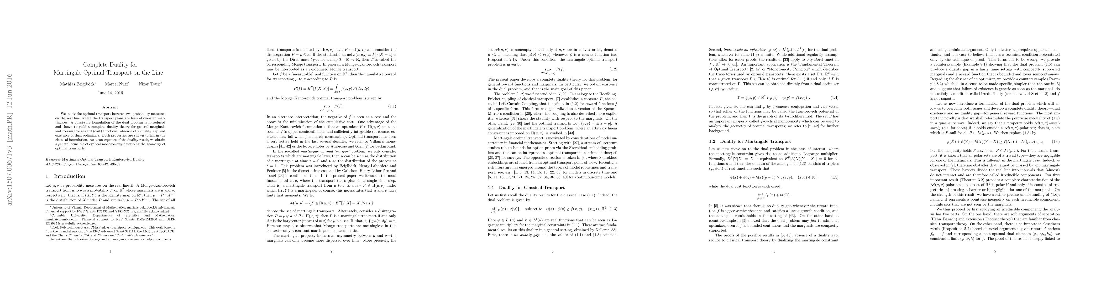 The paper introduces a quasi-sure formulation of the dual problem for Martingale Optimal Transport on the line, providing a complete duality theory for general marginals and measurable reward functions, including absence of a duality gap and existence of dual optimizers.