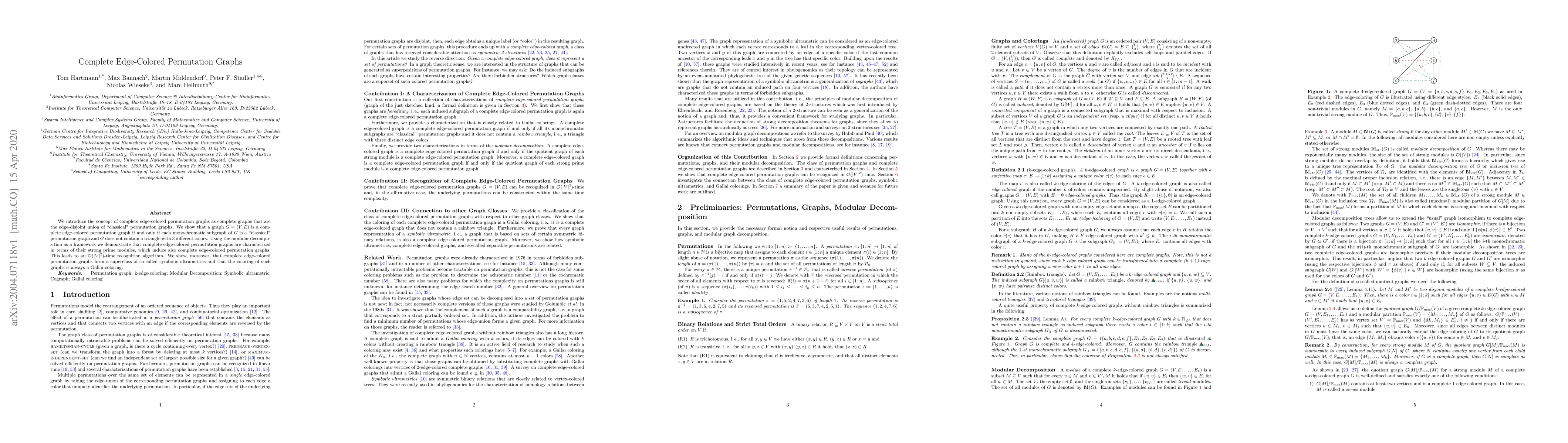 This paper defines complete edge-colored permutation graphs as complete graphs formed by the union of classical permutation graphs, with a focus on identifying conditions where a graph meets this criterion, including a lack of triangles with three distinct colors. An $\mathcal{O}(|V|^2)$-time recognition algorithm is developed using modular decomposition, highlighting their relationship to symbolic ultrametrics and Gallai colorings.