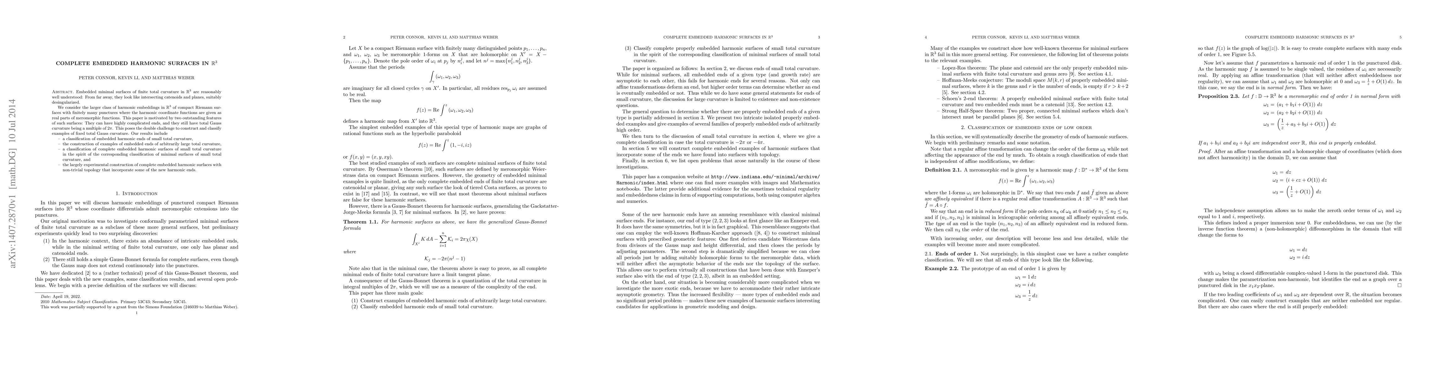 Embedded minimal surfaces of finite total curvature in $\mathbb{R}^3$ are reasonably well understood: From far away, they look like intersecting catenoids and planes, suitably desingularized. We consider the larger class of harmonic embeddings in $\mathbb{R}^{3}$ of compact Riemann surfaces with finitely many punctures where the harmonic coordinate functions are given as real parts of meromorphic functions. This paper is motivated by two outstanding features of such surfaces: They can have highly complicated ends, and they still have total Gauss curvature being a multiple of $2\pi$. This poses the double challenge to construct and classify examples of fixed total Gauss curvature. Our results include - a classification of embedded harmonic ends of small total curvature, - the construction of examples of embedded ends of arbitrarily large total curvature, - a classification of complete embedded harmonic surfaces of small total curvature in the spirit of the corresponding classification of minimal surfaces of small total curvature, and - the largely experimental construction of complete embedded harmonic surfaces with non-trivial topology that incorporate some of the new harmonic ends.