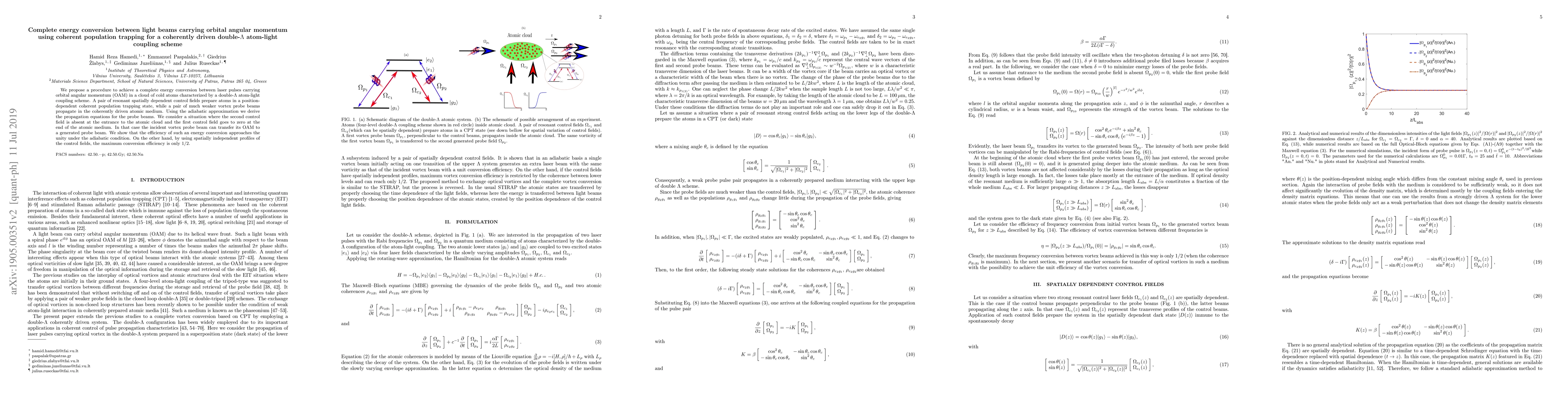 We propose a procedure to achieve a complete energy conversion between laser pulses carrying orbital angular momentum (OAM) in a cloud of cold atoms characterized by a double-\Lambda atom-light coupling scheme. A pair of resonant spatially dependent control fields prepare atoms in a position-dependent coherent population trapping state, while a pair of much weaker vortex probe beams propagate in the coherently driven atomic medium. Using the adiabatic approximation we derive the propagation equations for the probe beams. We consider a situation where the second control field is absent at the entrance to the atomic cloud and the first control field goes to zero at the end of the atomic medium. In that case the incident vortex probe beam can transfer its OAM to a generated probe beam. We show that the efficiency of such an energy conversion approaches the unity under the adiabatic condition. On the other hand, by using spatially independent profiles of the control fields, the maximum conversion efficiency is only 1/2.