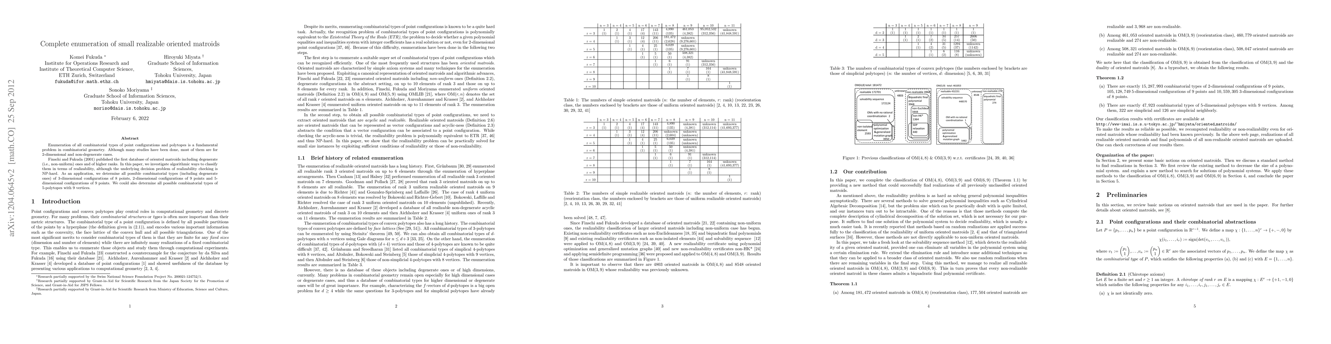 This research paper investigates ways to classify oriented matroids based on realizability, leading to the enumeration of various combinatorial types of point configurations and polytopes in different dimensions, including degenerate cases.