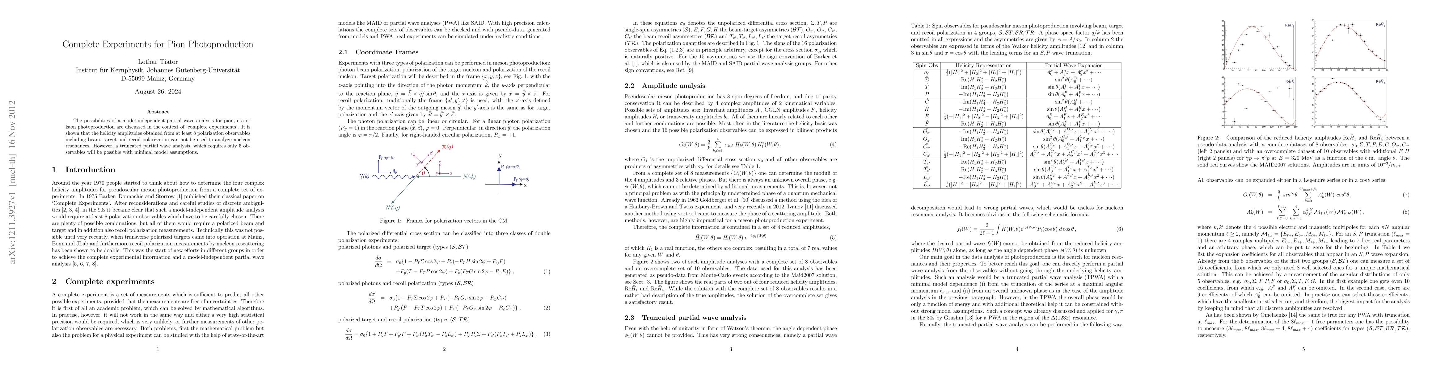 The possibilities of a model-independent partial wave analysis for pion, eta or kaon photoproduction are discussed in the context of complete experiments. It is shown that the helicity amplitudes obtained from at least 8 polarization observables including beam, target and recoil polarization can not be used to analyze nucleon resonances. However, a truncated partial wave analysis, which requires only 5 observables will be possible with minimal model assumptions.