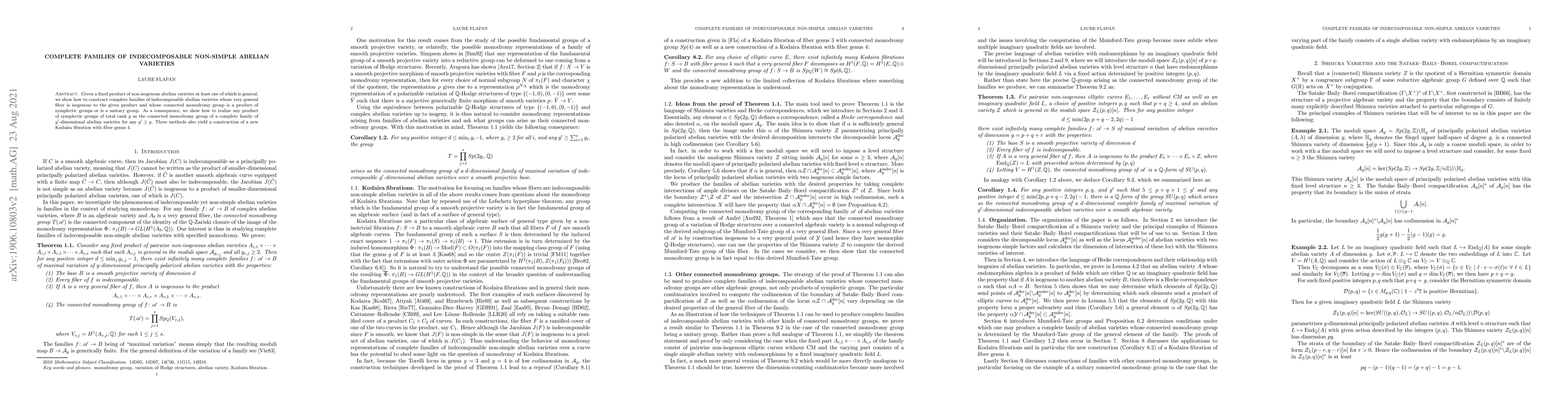 This paper constructs complete families of indecomposable abelian varieties that mirror a specified product of non-isogenous abelian varieties, with their connected monodromy groups being products of symplectic or unitary groups. It also demonstrates the realization of any product of symplectic groups as the monodromy group for a family of abelian varieties.