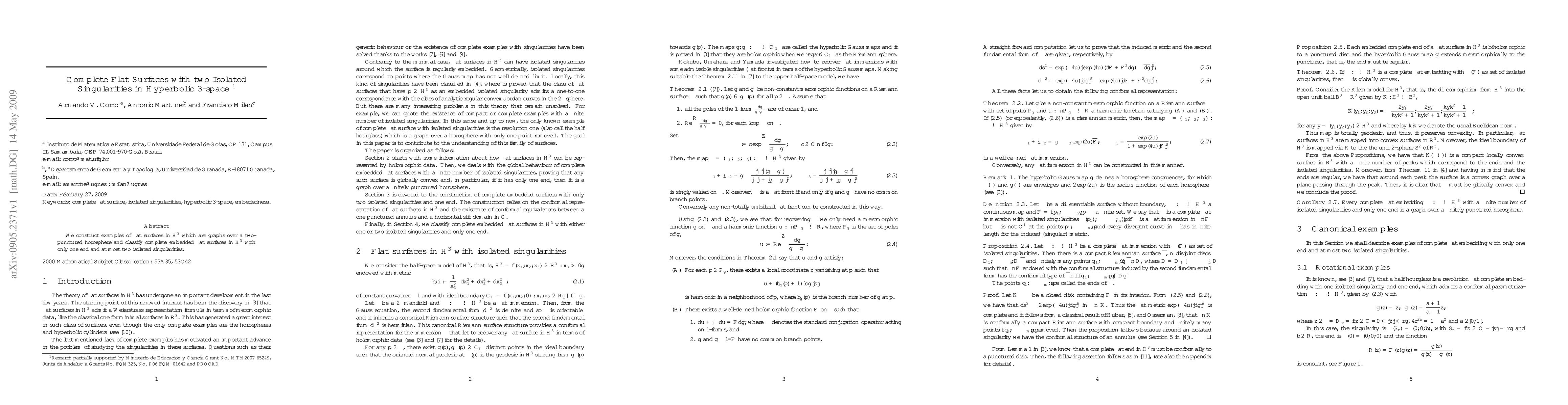 Summary: The paper constructs and classifies complete flat surfaces in hyperbolic 3-space, specifically focusing on those with a graph over a two-punctured horosphere and at most two isolated singularities, demonstrating their unique properties within hyperbolic geometry.