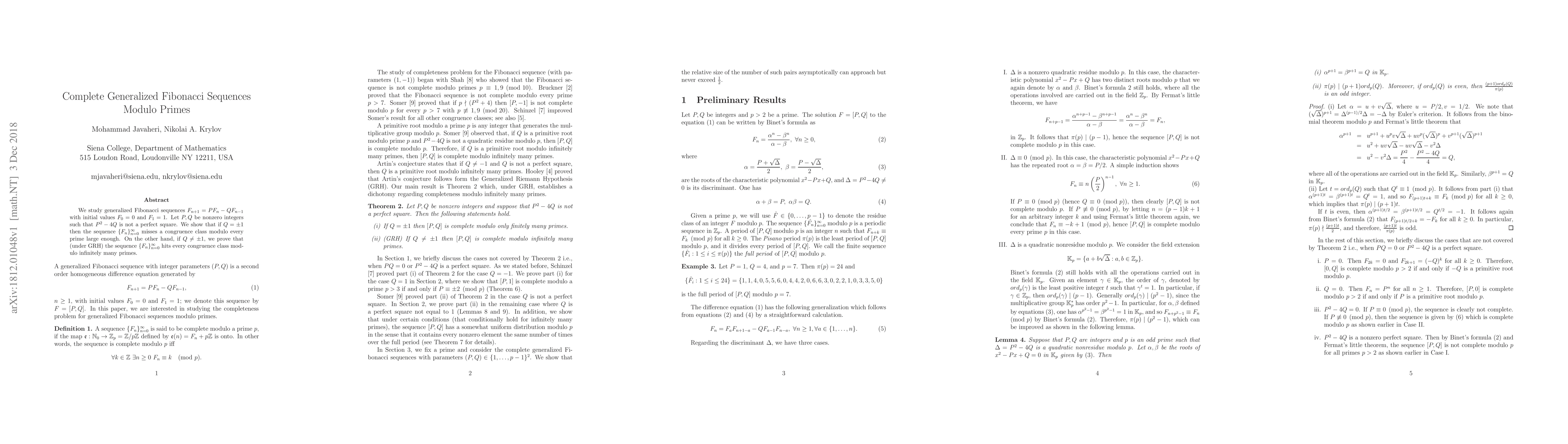The paper studies generalized Fibonacci sequences with specific initial values and prime coefficients. It finds that for certain values of Q, the sequence misses most congruence classes modulo large primes, while for other values of Q, it hits every class modulo infinitely many primes.