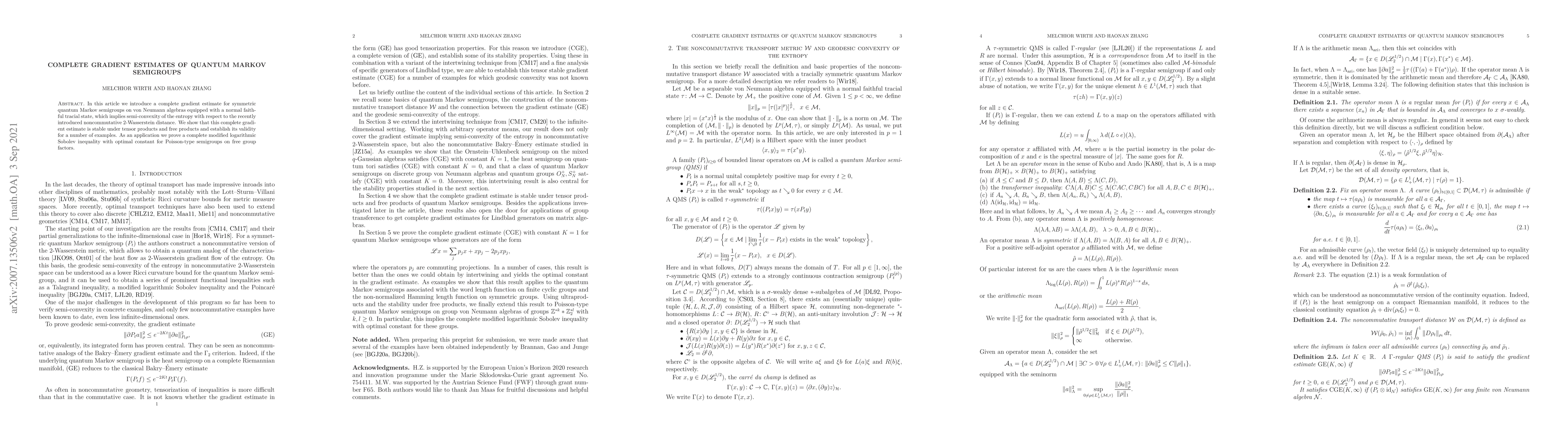 In this article we introduce a complete gradient estimate for symmetric quantum Markov semigroups on von Neumann algebras equipped with a normal faithful tracial state, which implies semi-convexity of the entropy with respect to the recently introduced noncommutative 2-Wasserstein distance. We show that this complete gradient estimate is stable under tensor products and free products and establish its validity for a number of examples. As an application we prove a complete modified logarithmic Sobolev inequality with optimal constant for Poisson-type semigroups on free group factors.