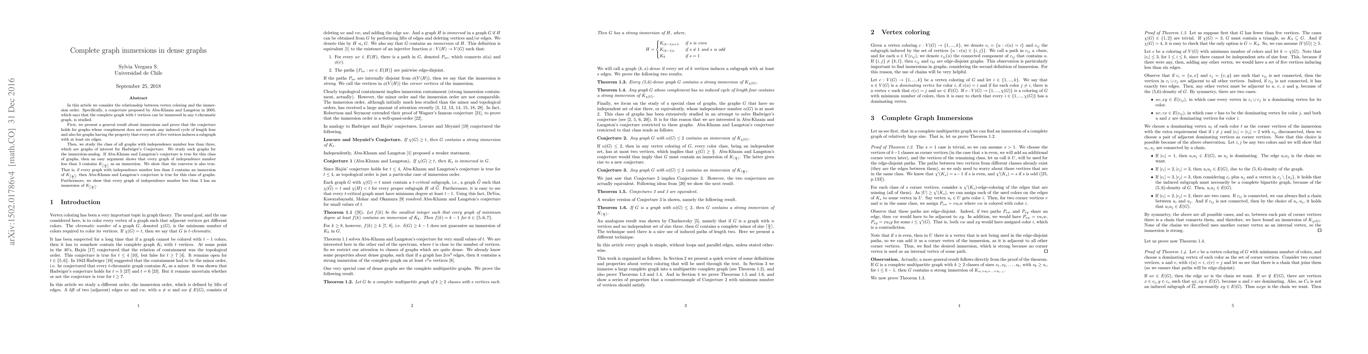 In this article we consider the relationship between vertex coloring and the immersion order. Specifically, a conjecture proposed by Abu-Khzam and Langston in 2003, which says that the complete graph with $t$ vertices can be immersed in any $t$-chromatic graph, is studied. First, we present a general result about immersions and prove that the conjecture holds for graphs whose complement does not contain any induced cycle of length four and also for graphs having the property that every set of five vertices induces a subgraph with at least six edges. Then, we study the class of all graphs with independence number less than three, which are graphs of interest for Hadwiger's Conjecture. We study such graphs for the immersion-analog. If Abu-Khzam and Langston's conjecture is true for this class of graphs, then an easy argument shows that every graph of independence number less than $3$ contains $K_{\left\lceil\frac{n}{2}\right\rceil}$ as an immersion. We show that the converse is also true. That is, if every graph with independence number less than $3$ contains an immersion of $K_{\left\lceil\frac{n}{2}\right\rceil}$, then Abu-Khzam and Langston's conjecture is true for this class of graphs. Furthermore, we show that every graph of independence number less than $3$ has an immersion of $K_{\left\lceil\frac{n}{3}\right\rceil}$.