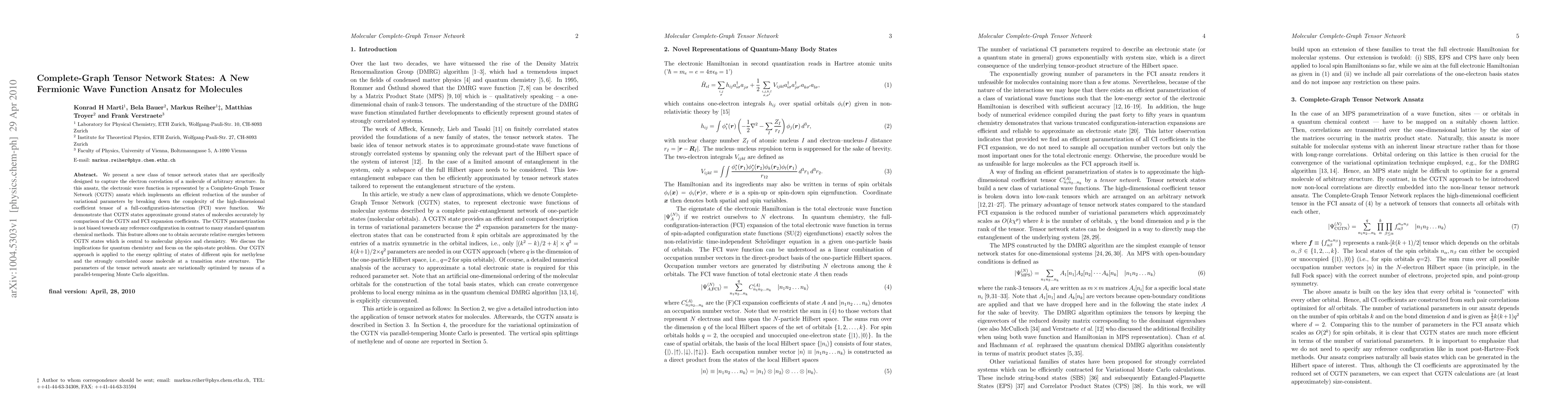 We present a new class of tensor network states that are specifically designed to capture the electron correlation of a molecule of arbitrary structure. In this ansatz, the electronic wave function is represented by a Complete-Graph Tensor Network (CGTN) ansatz which implements an efficient reduction of the number of variational parameters by breaking down the complexity of the high-dimensional coefficient tensor of a full-configuration-interaction (FCI) wave function. We demonstrate that CGTN states approximate ground states of molecules accurately by comparison of the CGTN and FCI expansion coefficients. The CGTN parametrization is not biased towards any reference configuration in contrast to many standard quantum chemical methods. This feature allows one to obtain accurate relative energies between CGTN states which is central to molecular physics and chemistry. We discuss the implications for quantum chemistry and focus on the spin-state problem. Our CGTN approach is applied to the energy splitting of states of different spin for methylene and the strongly correlated ozone molecule at a transition state structure. The parameters of the tensor network ansatz are variationally optimized by means of a parallel-tempering Monte Carlo algorithm.