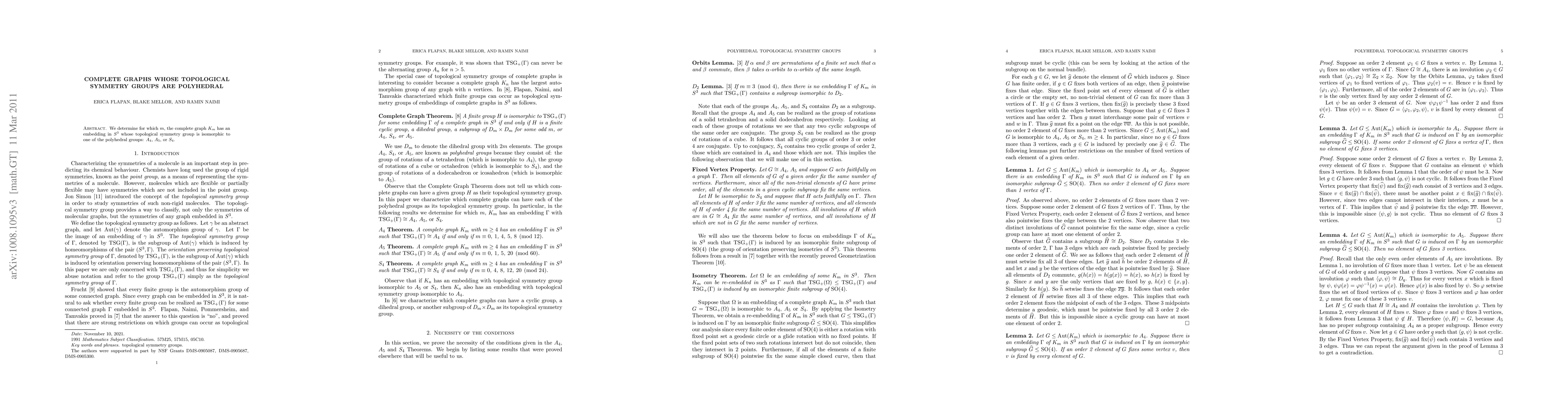 This paper investigates when the complete graph $K_m$ can be embedded in $S^3$ with a topological symmetry group isomorphic to $A_4$, $A_5$, or $S_4$. The findings specify the values of $m$ that allow such embeddings.