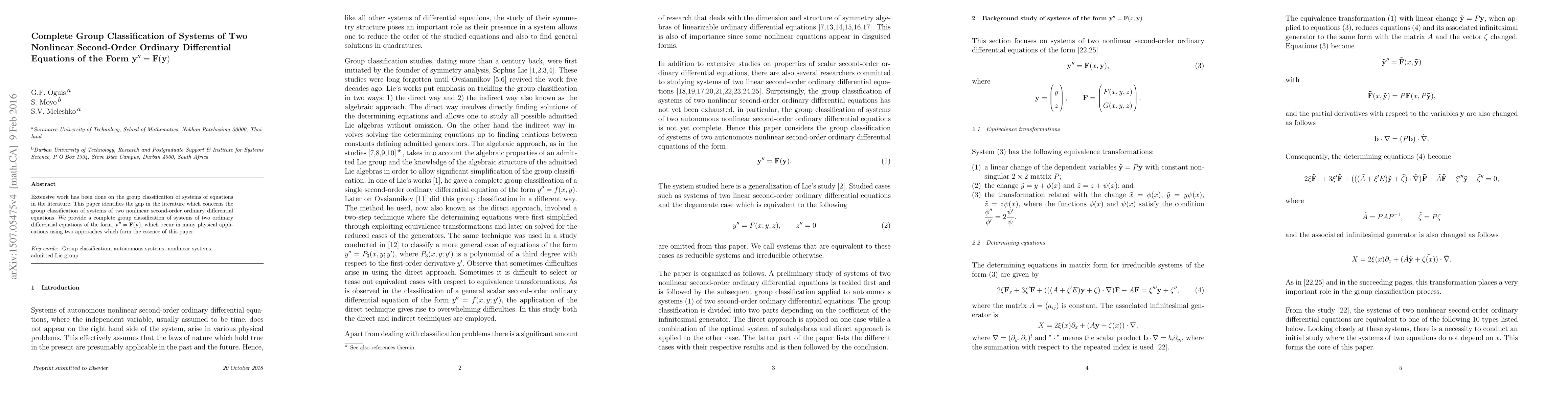 This paper provides a complete group classification for systems of two autonomous nonlinear second-order ordinary differential equations, addressing a gap in existing literature. The classification is achieved through two methodological approaches, which can be applied to physical systems involving such differential equations.