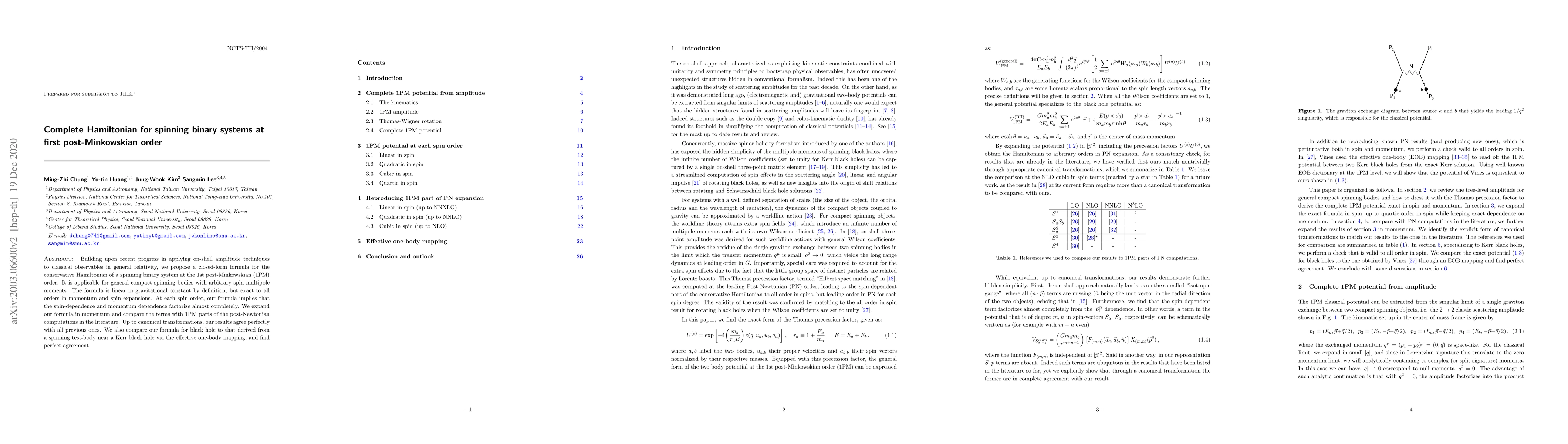 Building upon recent progress in applying on-shell amplitude techniques to classical observables in general relativity, we propose a closed-form formula for the conservative Hamiltonian of a spinning binary system at the 1st post-Minkowskian (1PM) order. It is applicable for general spinning bodies with arbitrary spin multipole moments. The formula is linear in gravitational constant by definition, but exact to all orders in momentum and spin expansions. At each spin order, our formula implies that the spin-dependence and momentum dependence factorize almost completely. We expand our formula in momentum and compare the terms with 1PM parts of the post-Newtonian computations in the literature. Up to canonical transformations, our results agree perfectly with all previous ones. We also compare our formula for black hole to that derived from a spinning test-body near a Kerr black hole via the effective one-body mapping, and find perfect agreement.