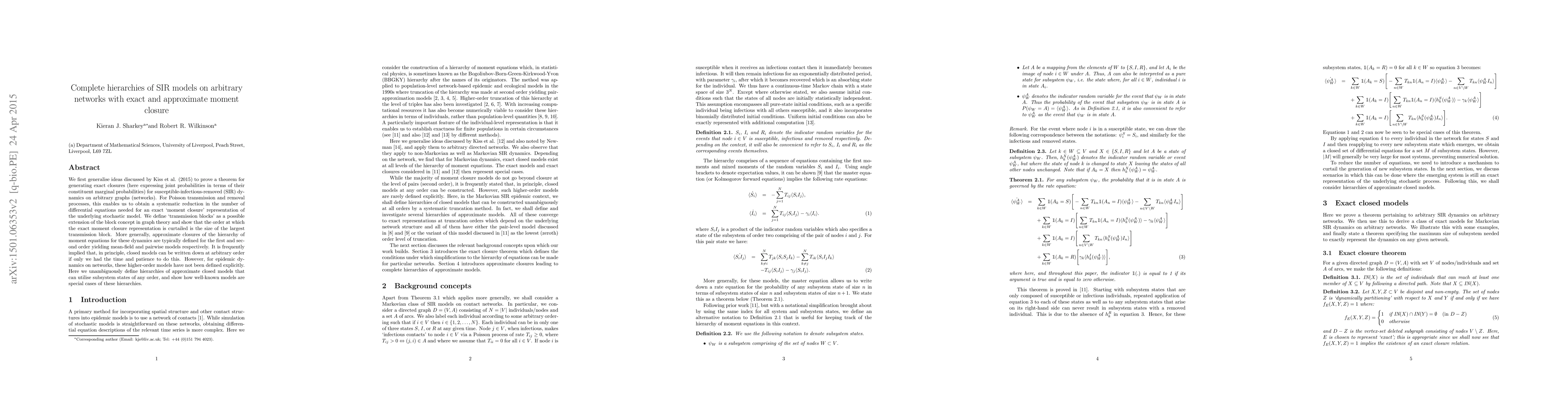 This paper generalizes exact moment closure methods for SIR dynamics on arbitrary networks, reducing the number of differential equations through transmission blocks. It also defines hierarchies of approximate closures, including higher-order models, and shows how existing models fit within these hierarchies.
