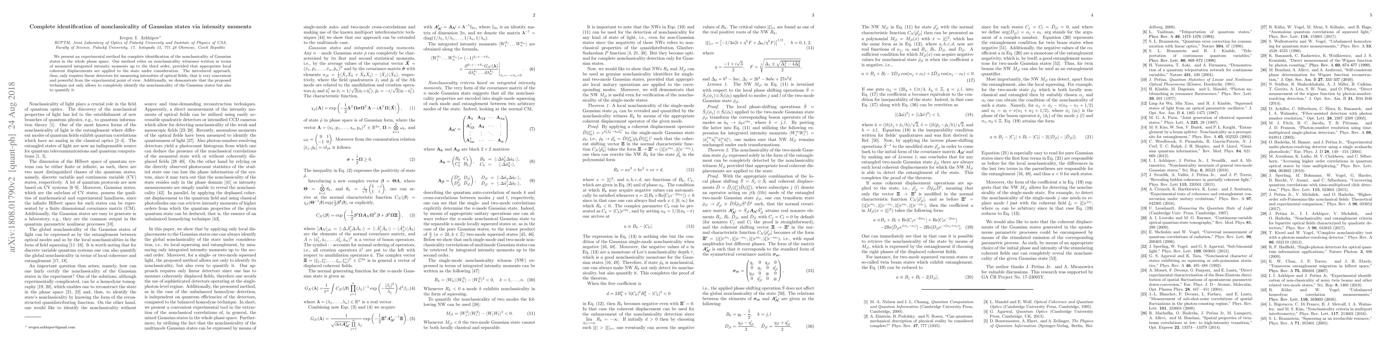 This paper proposes an experimental method for fully identifying and quantifying the nonclassicality of Gaussian states using intensity moments up to the third order, facilitated by local coherent displacements and linear detectors. The technique is both practical and effective for experimental applications.