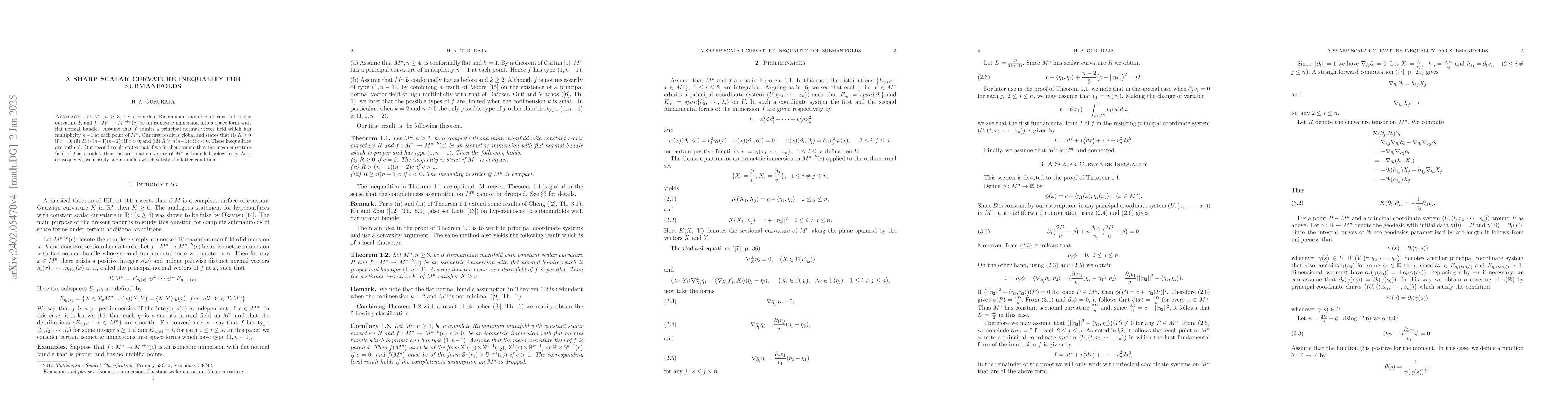 Let $M$ be a complete Riemannian manifold with constant scalar curvature $R$ and dimension $n\geq 3,$ and let $f: M\rightarrow M^{n+k}(c)$ be a proper isometric immersion with flat normal bundle and type $(1, n-1)$ in a complete simply-connected Riemannian space form $M^{n+k}(c)$ of constant sectional curvature $c$ and dimension $n+k.$ Our first result is global and states that $R\geq 0$ if $c= 0,\ R> \frac{(n-1)(n-2)}{2}c$ if $c> 0,$ and $R\geq \frac{n(n-1)}{2}c$ if $c< 0.$ Our second result is of a local character and states that, if in addition we assume that $c\geq 0$ and the mean curvature field of the immersion is parallel in the normal bundle, then $M$ has non-negative sectional curvature.