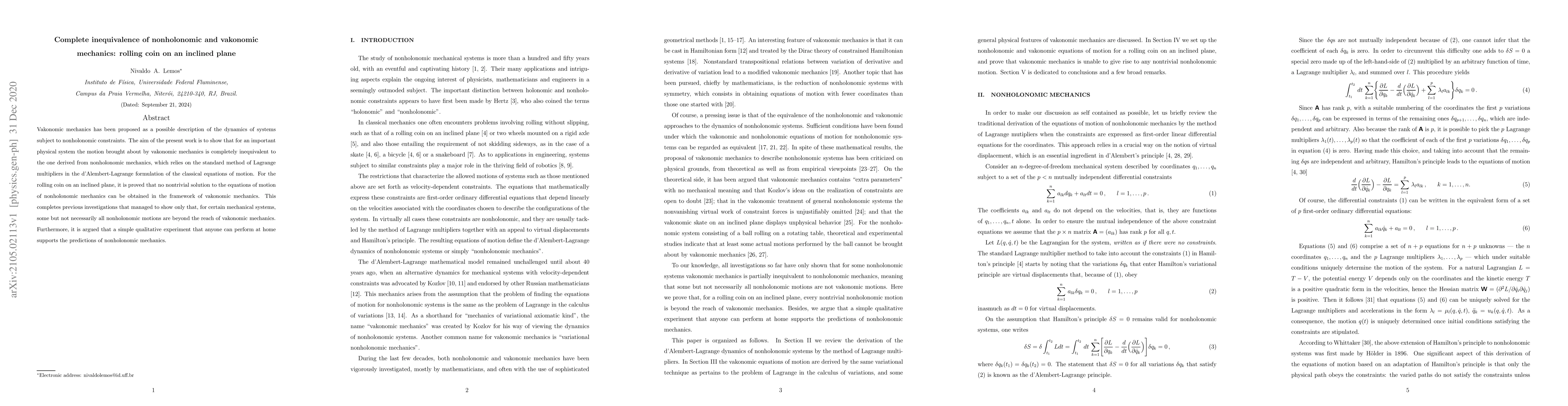 This paper demonstrates that vakonomic mechanics fails to describe the dynamics of a rolling coin on an inclined plane, showing complete inequivalence to nonholonomic mechanics. It concludes with an argument that a simple experiment corroborates nonholonomic mechanics' predictions.