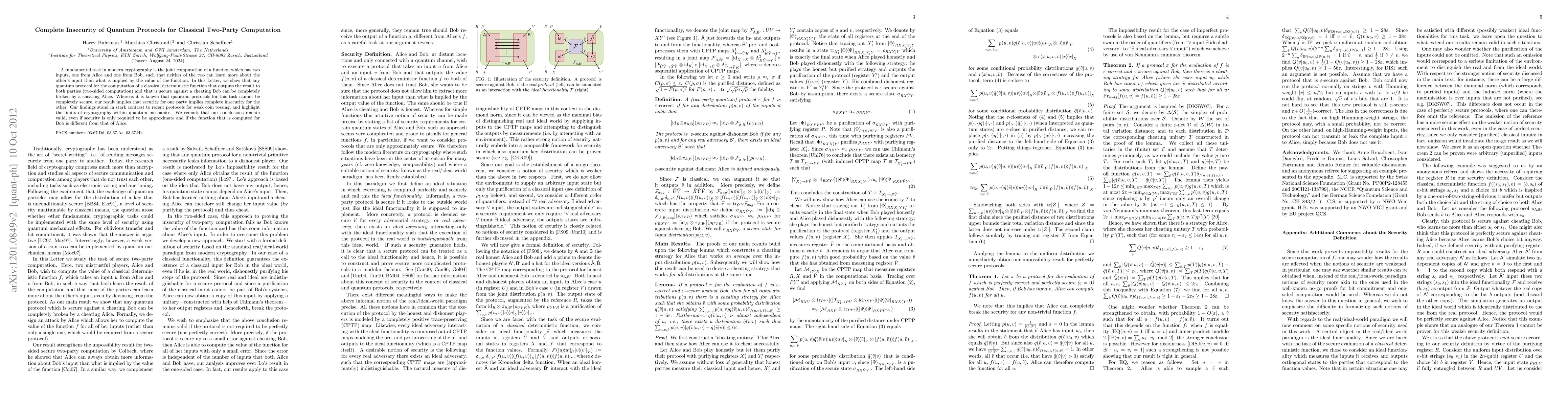 This paper demonstrates that quantum protocols for secure two-party computation are fundamentally insecure; if secure for one party, they guarantee complete insecurity for the other. This finding contrasts with recent weak coin tossing protocols and underscores the limitations of quantum cryptography.