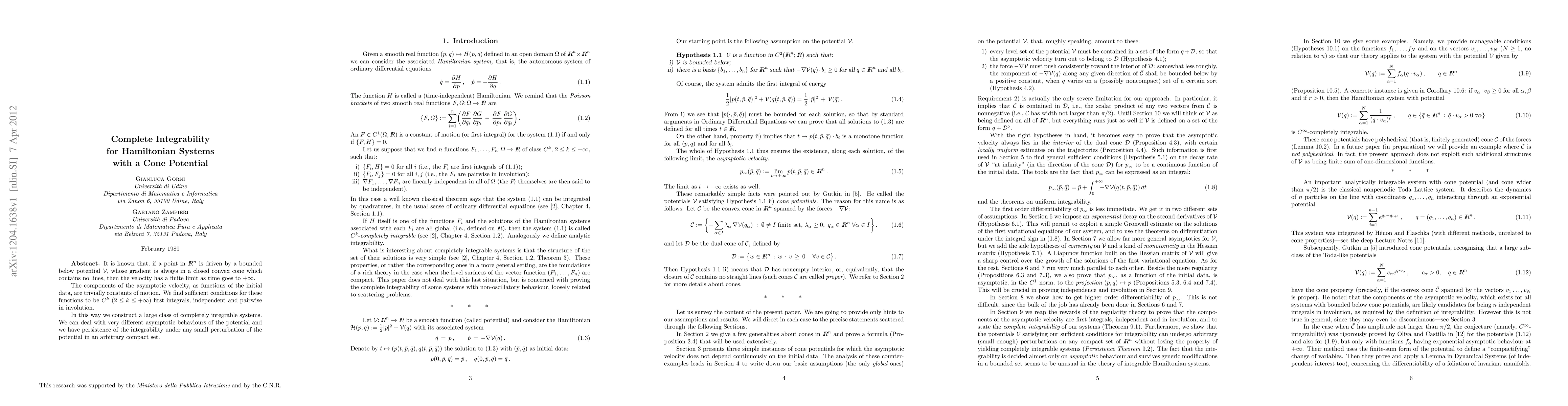 It is known that, if a point in $R^n$ is driven by a bounded below potential $V$, whose gradient is always in a closed convex cone which contains no lines, then the velocity has a finite limit as time goes to $+\infty$. The components of the asymptotic velocity, as functions of the initial data, are trivially constants of motion. We find sufficient conditions for these functions to be $C^k$ ($2\le k \le+\infty$) first integrals, independent and pairwise in involution. In this way we construct a large class of completely integrable systems. We can deal with very different asymptotic behaviours of the potential and we have persistence of the integrability under any small perturbation of the potential in an arbitrary compact set.