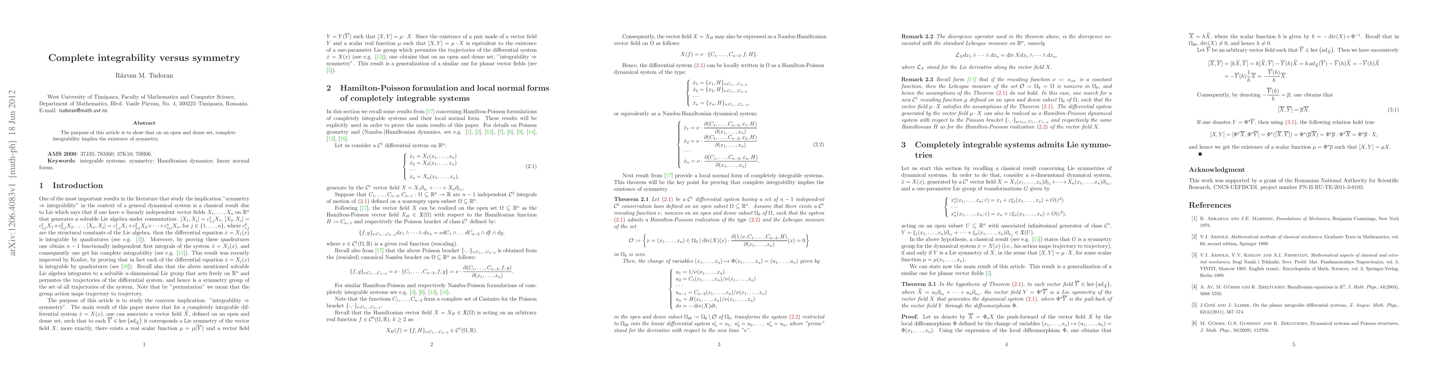 Summary: This article demonstrates that on an open and dense subset of a given space, complete integrability guarantees the existence of symmetry. The findings highlight a fundamental relationship between these two concepts in mathematical physics.