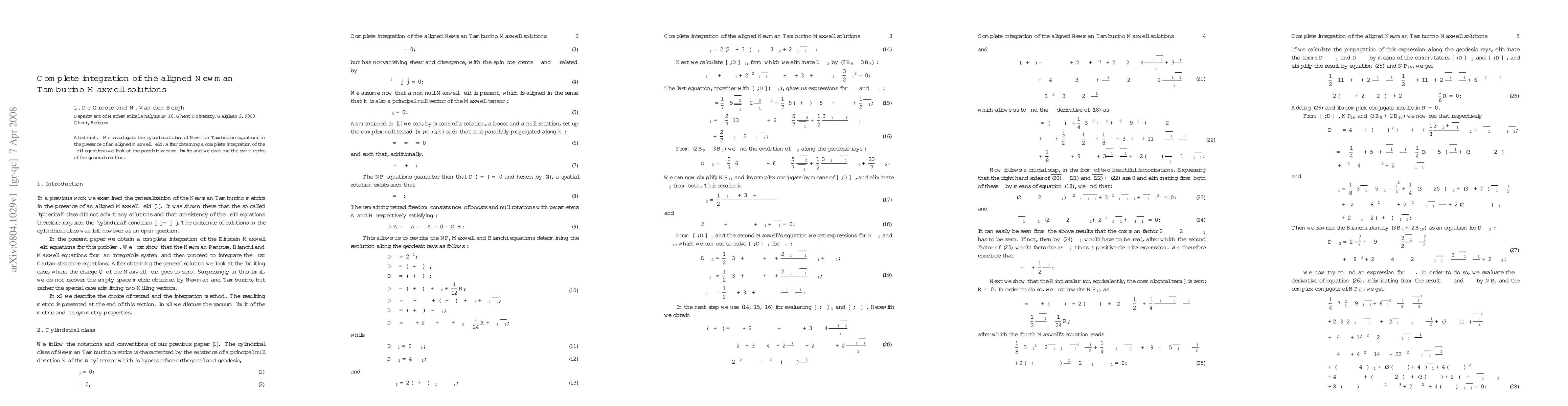 The paper presents a comprehensive solution to the Newman Tamburino equations for cylindrical spacetime with an aligned Maxwell field. It explores vacuum limits and symmetries of the general solution, offering insights into gravitational and electromagnetic field interactions.