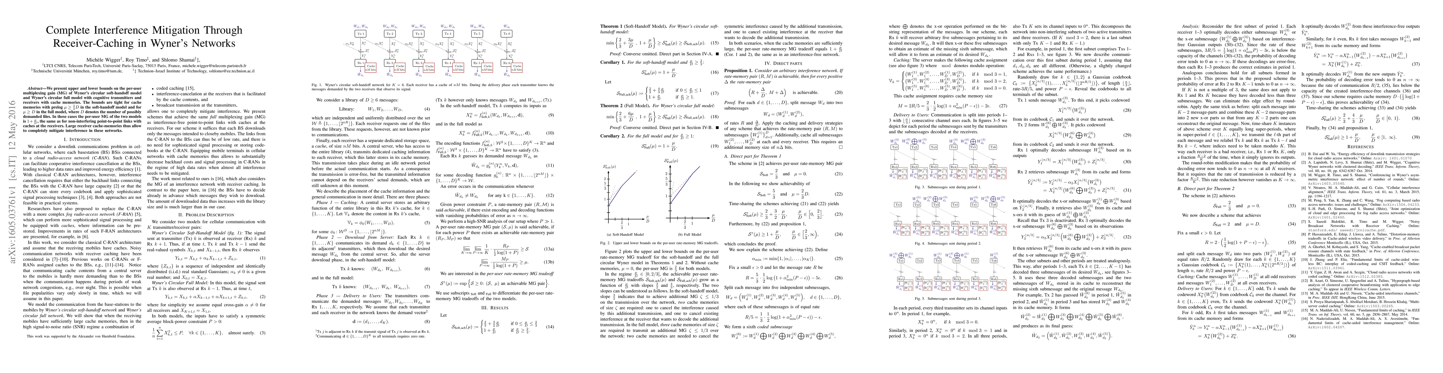 Researchers found that using large cache memories at receivers can completely mitigate interference in Wyner's networks, achieving the same per-user multiplexing gain as non-interfering point-to-point links with caches.