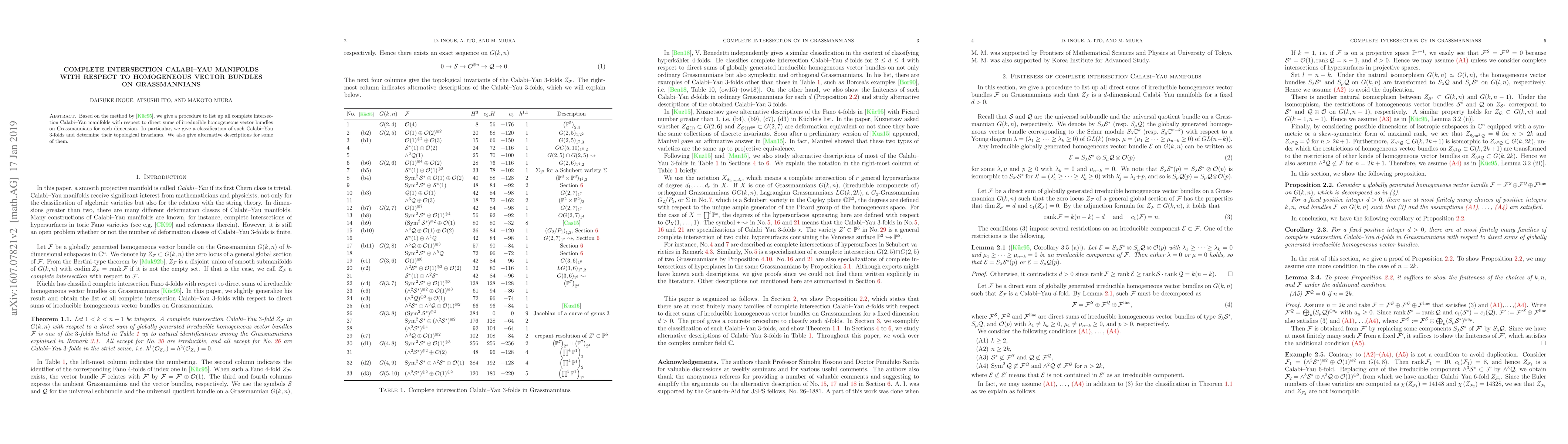 This paper presents a method to identify all complete intersection Calabi-Yau manifolds derived from direct sums of irreducible homogeneous vector bundles on Grassmannians. It classifies Calabi-Yau 3-folds and determines their topological invariants, offering alternative descriptions for some.