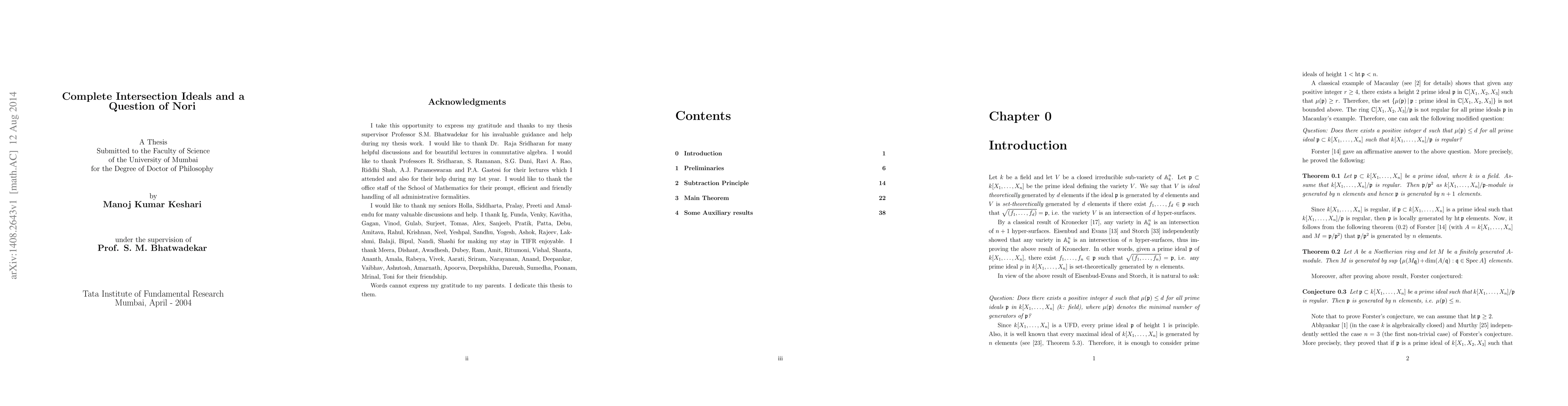 This research, a 2004 PhD thesis by [Author] under Prof. S.M. Bhatwadekar, answers a question posed by Nori. It proves that given certain conditions on an ideal I in a smooth affine domain A[T] of dimension d over an infinite perfect field, there exists a surjection Phi from A[T]^n to I satisfying specific properties. This work is a collaboration with S.M. Bhatwadekar.