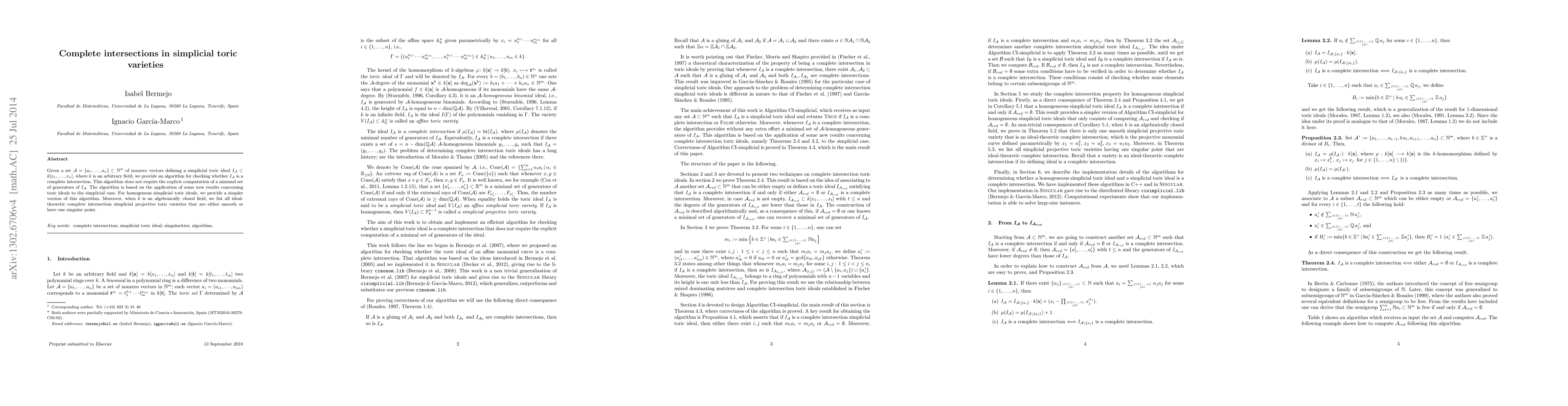 This paper presents an algorithm to determine if a simplicial toric ideal is a complete intersection without computing its minimal generators, leveraging new results on toric ideals. It also provides a simpler version for homogeneous cases and classifies complete intersection simplicial projective toric varieties over algebraically closed fields.