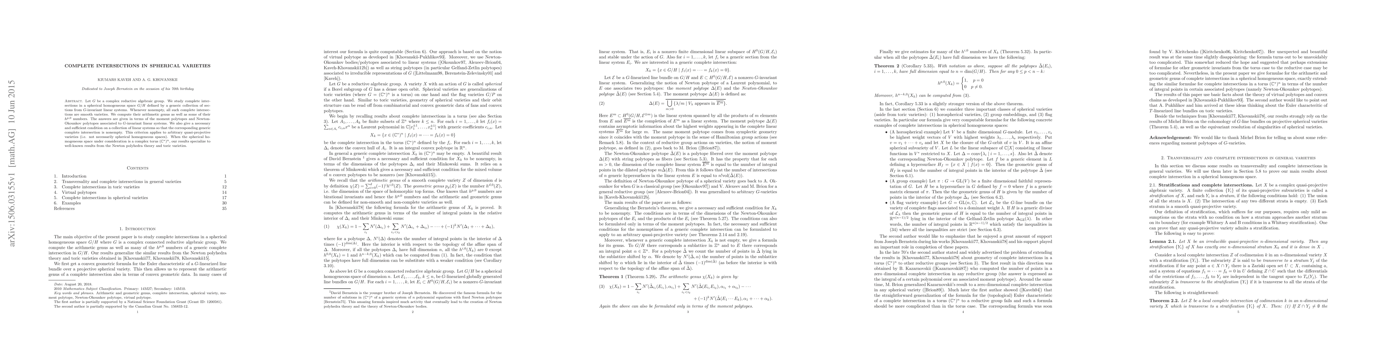 This paper investigates complete intersections in spherical homogeneous spaces of a complex reductive algebraic group G, showing they are smooth and computing their arithmetic genus and certain h^{p,0} numbers, using moment and Newton-Okounkov polytopes. It provides a criterion for nonempty intersections applicable to quasi-projective varieties.