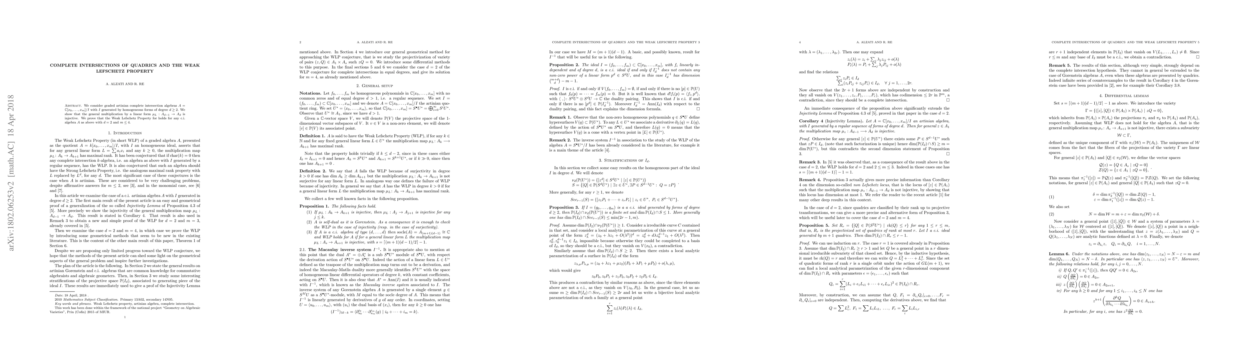 We consider artinian algebras $A=\mathbb{C}[x_0,\ldots,x_m]/I$, with $I$ generated by a regular sequence of homogeneous forms of the same degree $d\geq 2$. We show that the multiplication by a general linear form from $A_{d-1}$ to $A_d$ is injective. We prove that the Weak Lefschetz Property holds for artinian complete intersection algebras as above, with $d=2$ and $m\leq 4$. Apparently, this was previously known only for $m\leq 3$. Although we are proposing only very limited progress towards the WLP conjecture for complete intersections, we hope that the methods of the present article can illustrate some geometrical aspects of the general problem.