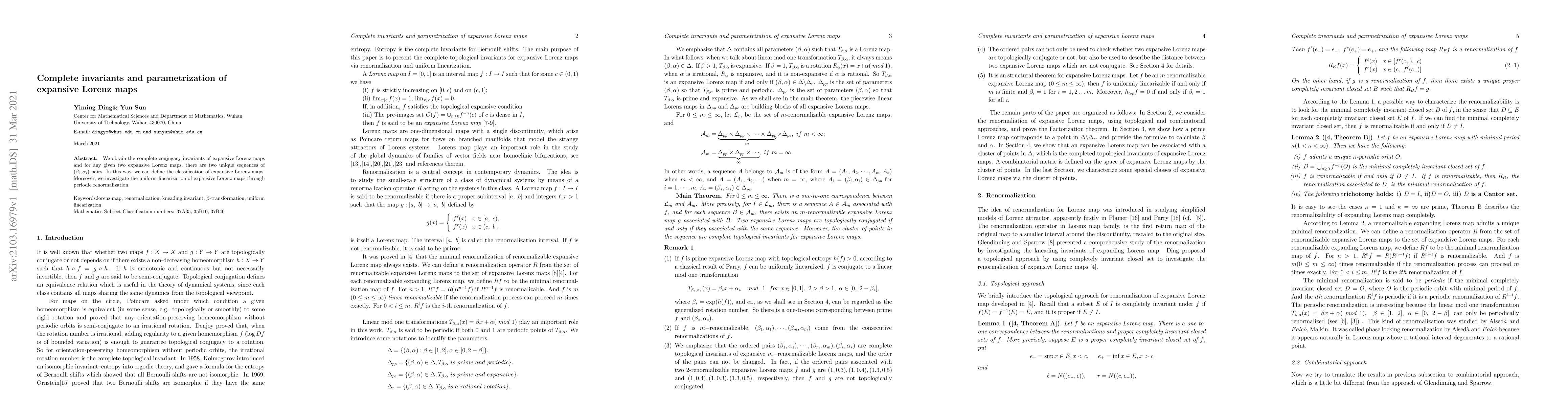 This paper identifies complete conjugacy invariants for expansive Lorenz maps, providing a unique classification scheme based on sequences of $(\beta_{i},\alpha_{i})$ pairs. It also explores the uniform linearization of these maps via periodic renormalization techniques.
