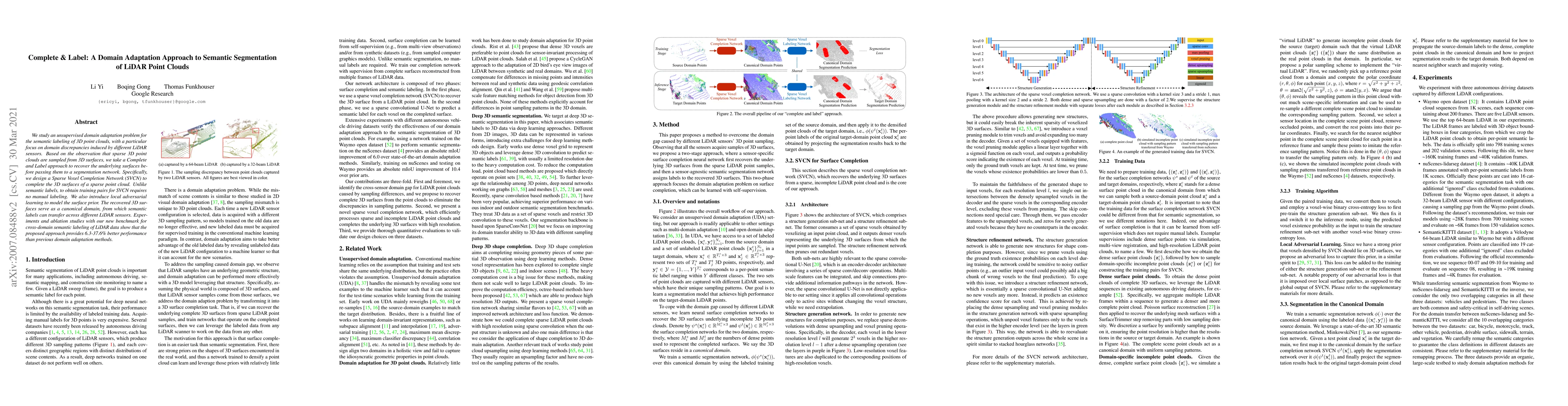 This paper proposes an unsupervised domain adaptation approach for semantic labeling of 3D LiDAR point clouds, focusing on discrepancies from different sensors. It introduces a Sparse Voxel Completion Network (SVCN) to recover underlying 3D surfaces and uses local adversarial learning to model surface priors, achieving 8.2-36.6% better performance than previous methods on a new benchmark.