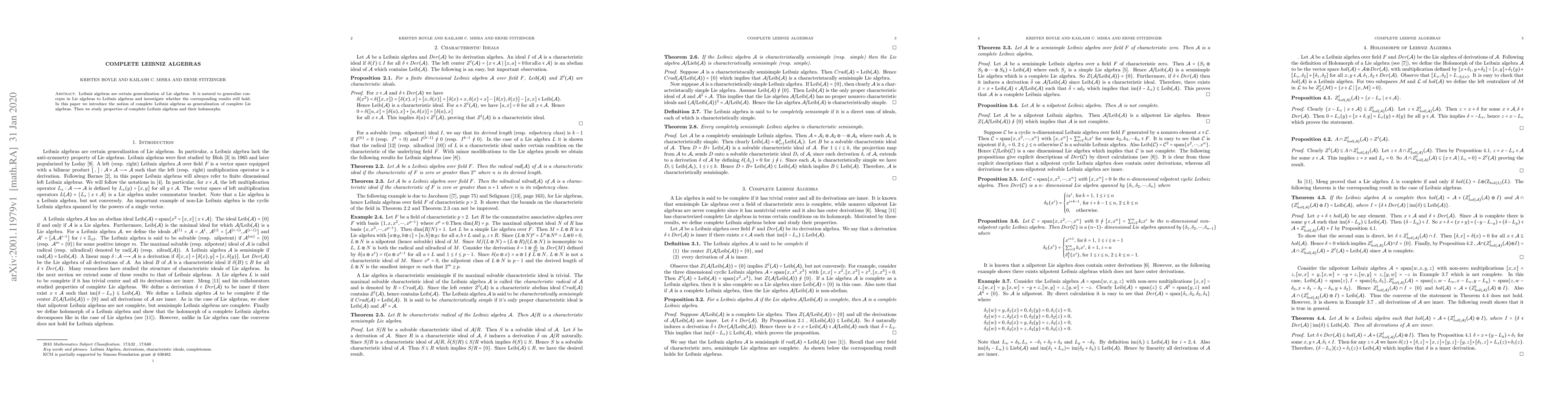 The paper defines and studies complete Leibniz algebras, proving their properties and relationships with their holomorphs, extending known results from Lie algebras to Leibniz algebras.