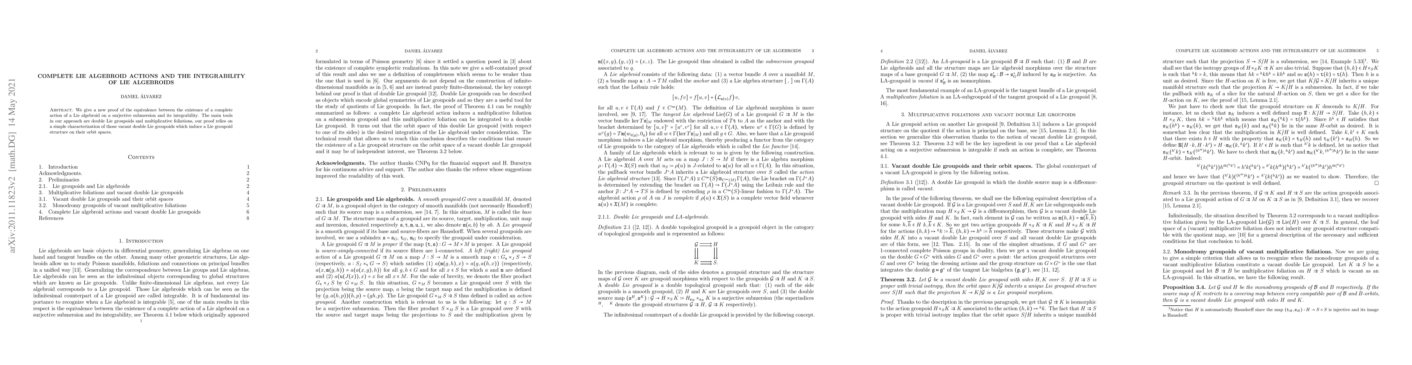 We give a new proof of the equivalence between the existence of a complete action of a Lie algebroid on a surjective submersion and its integrability. The main tools in our approach are double Lie groupoids and multiplicative foliations, our proof relies on a simple characterization of those vacant double Lie groupoids which induce a Lie groupoid structure on their orbit spaces.