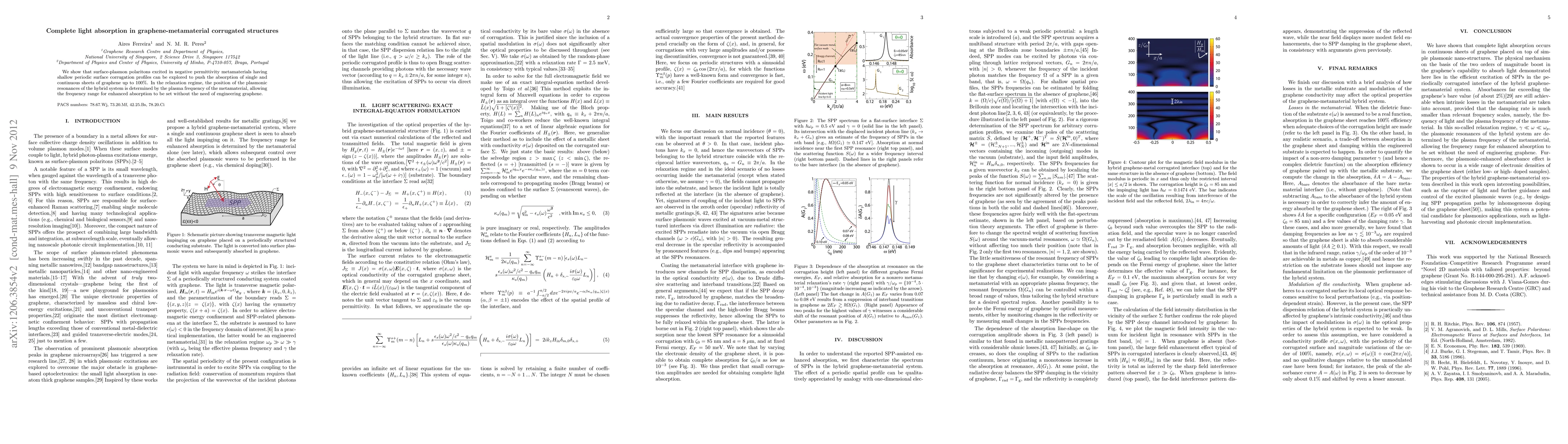 This paper demonstrates that graphene-metamaterial structures with shallow periodic surface corrugations can achieve complete light absorption up to 100% by exploiting surface-plasmon polaritons in negative permittivity metamaterials, with resonance positions determined by the metamaterial's plasma frequency.
